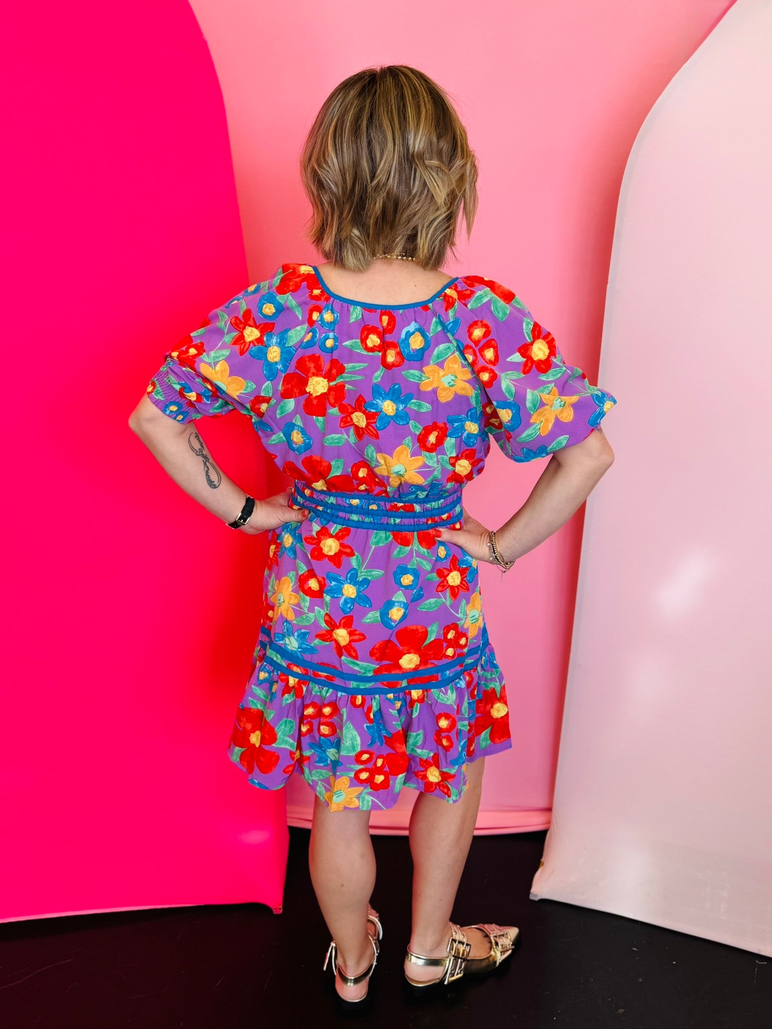 Step into effortless femininity with our Lavender Bloom Smocked Dress, a playful and flattering mini dress designed to brighten any occasion. Crafted from lightweight 100% polyester, this dress showcases a vibrant allover floral print bursting with color, making it a standout choice for spring, summer, brunch dates, or weekend outings. The flattering scoop neckline features delicate piping and a charming tie detail that adds a touch of sweetness, while the puff sleeves provide soft volume for a romantic silhouette. A comfortable smocked waist cinches the figure beautifully, creating a defined shape that flows into a breezy mini-length skirt. Easy to wear and endlessly versatile, this floral dress pairs perfectly with sandals, wedges, or sneakers for a fresh and feminine look.