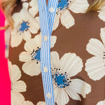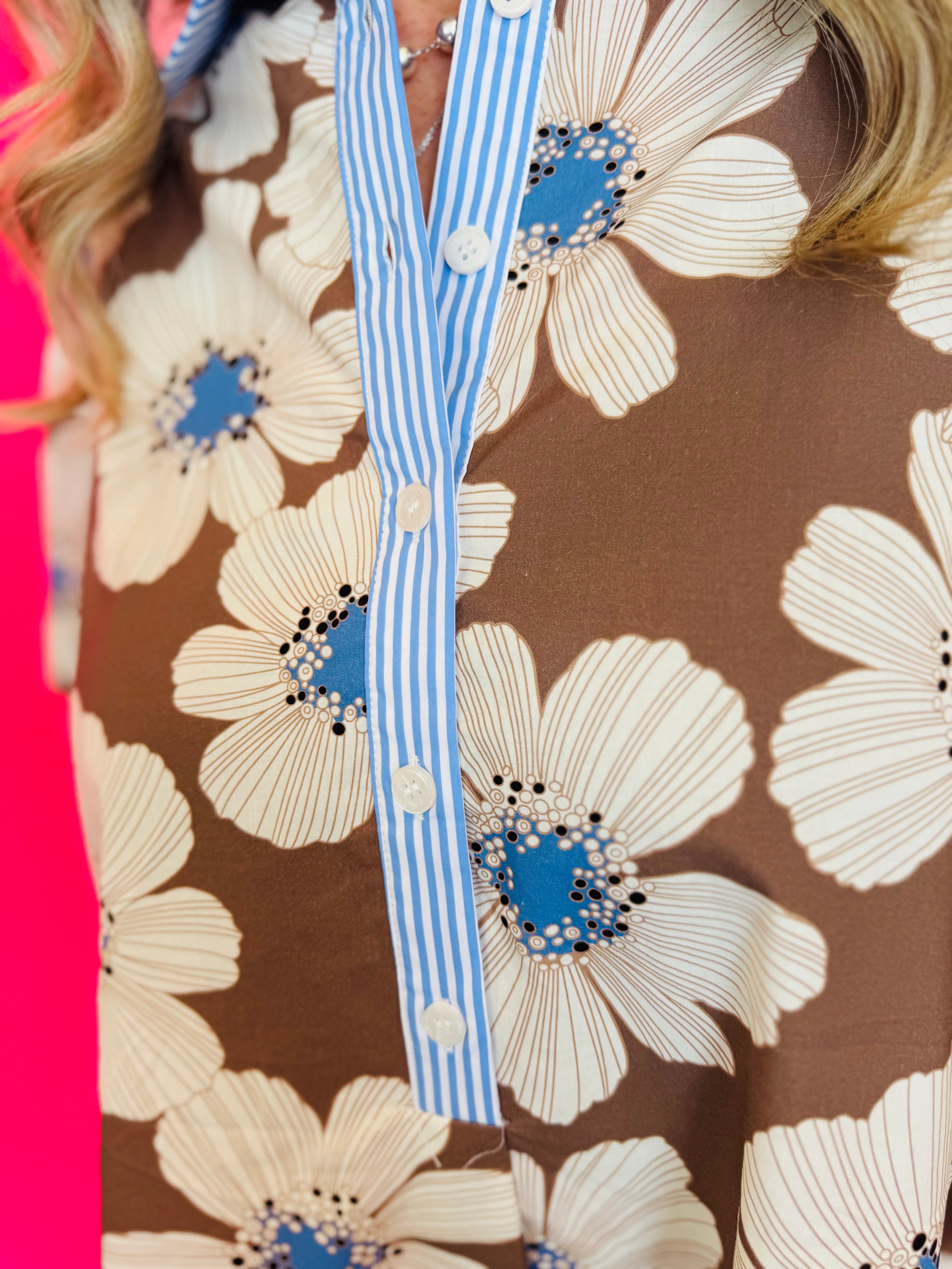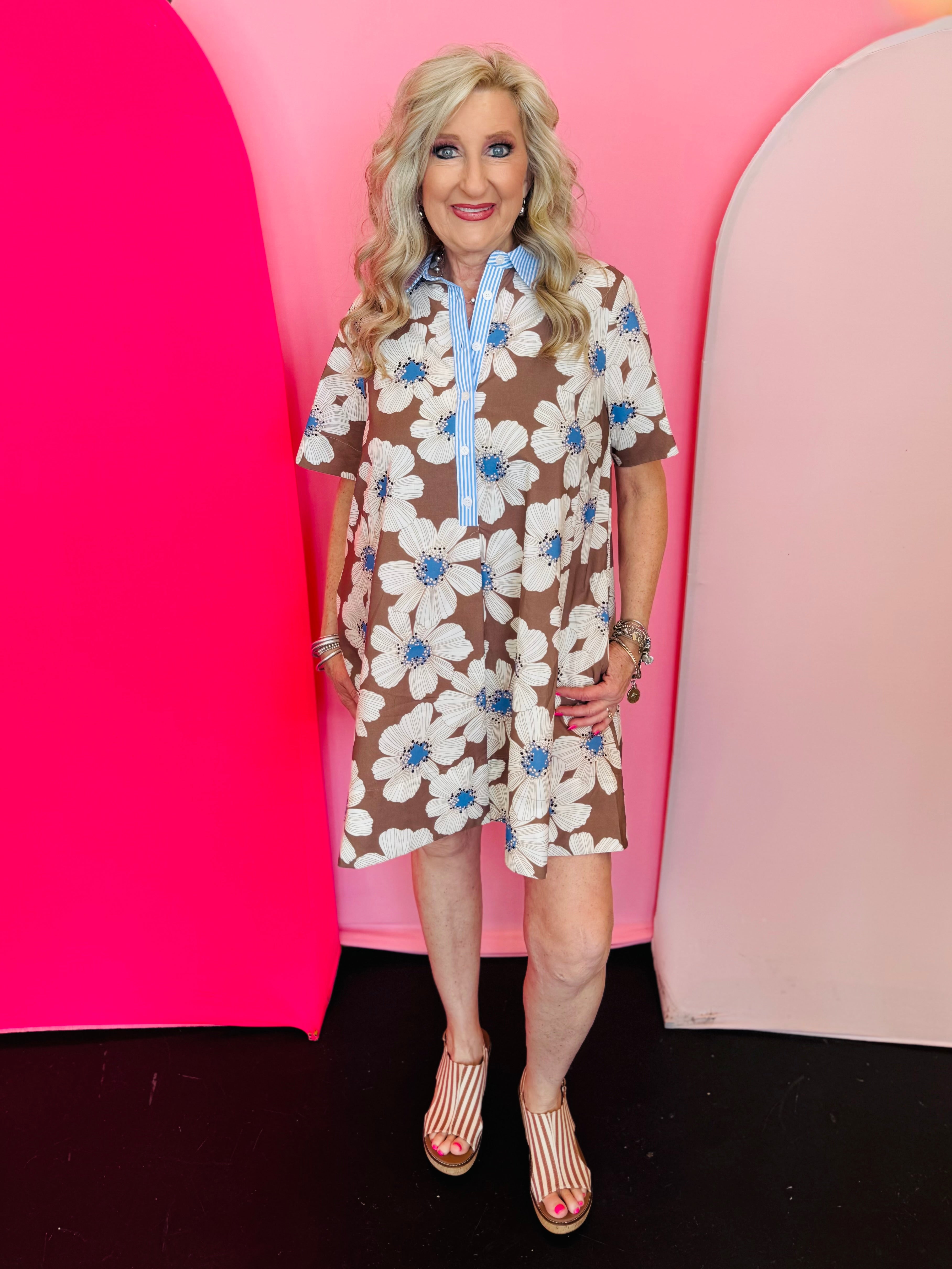 Designed with a warm brown background and oversized floral prints in soft white and blue, this dress has a relaxed, feminine feel that works beautifully from casual days to weekend outings. The collared neckline features striped contrast trim, adding a fun pop of detail that gives this dress a unique, boutique-style touch.