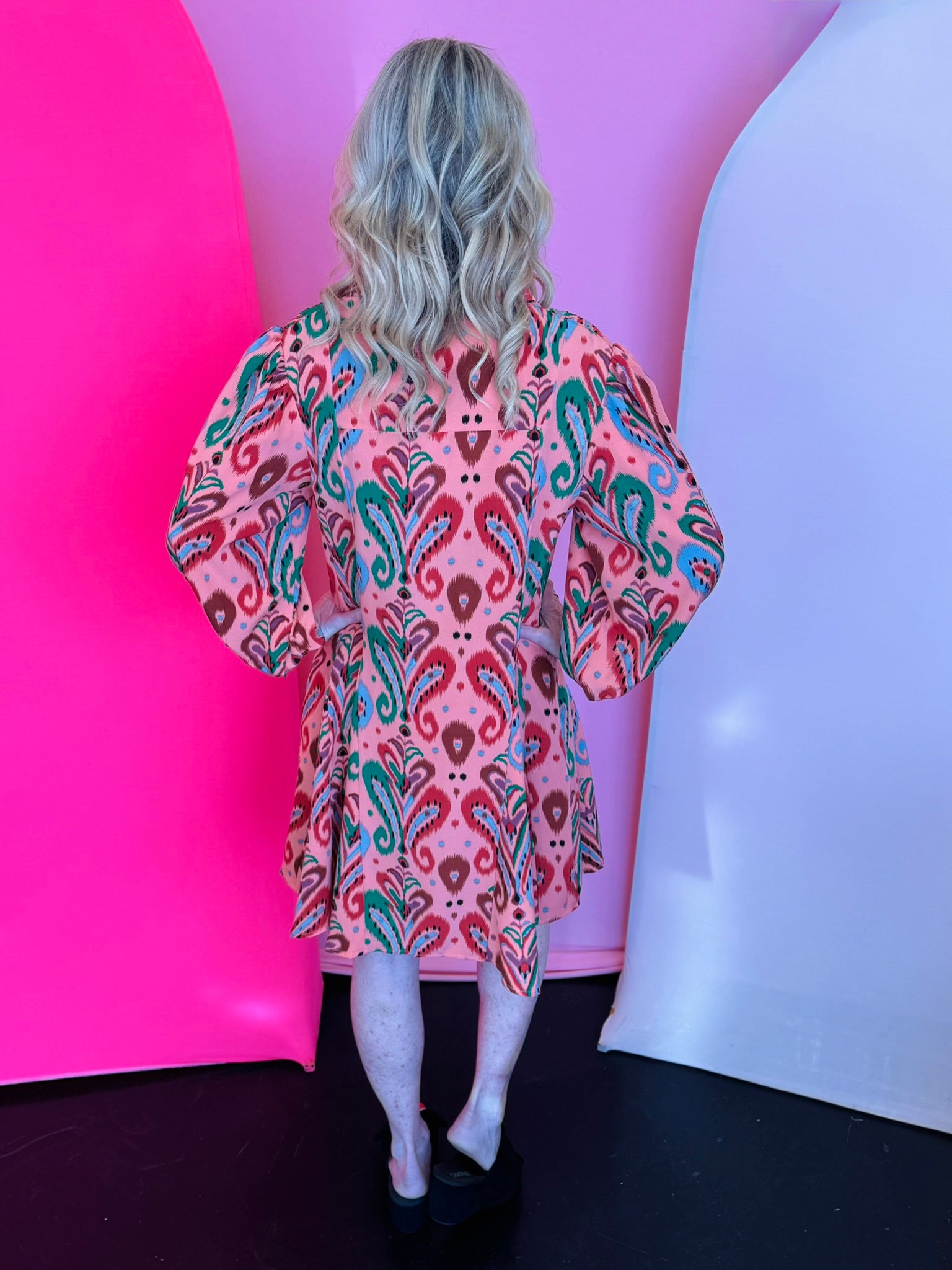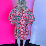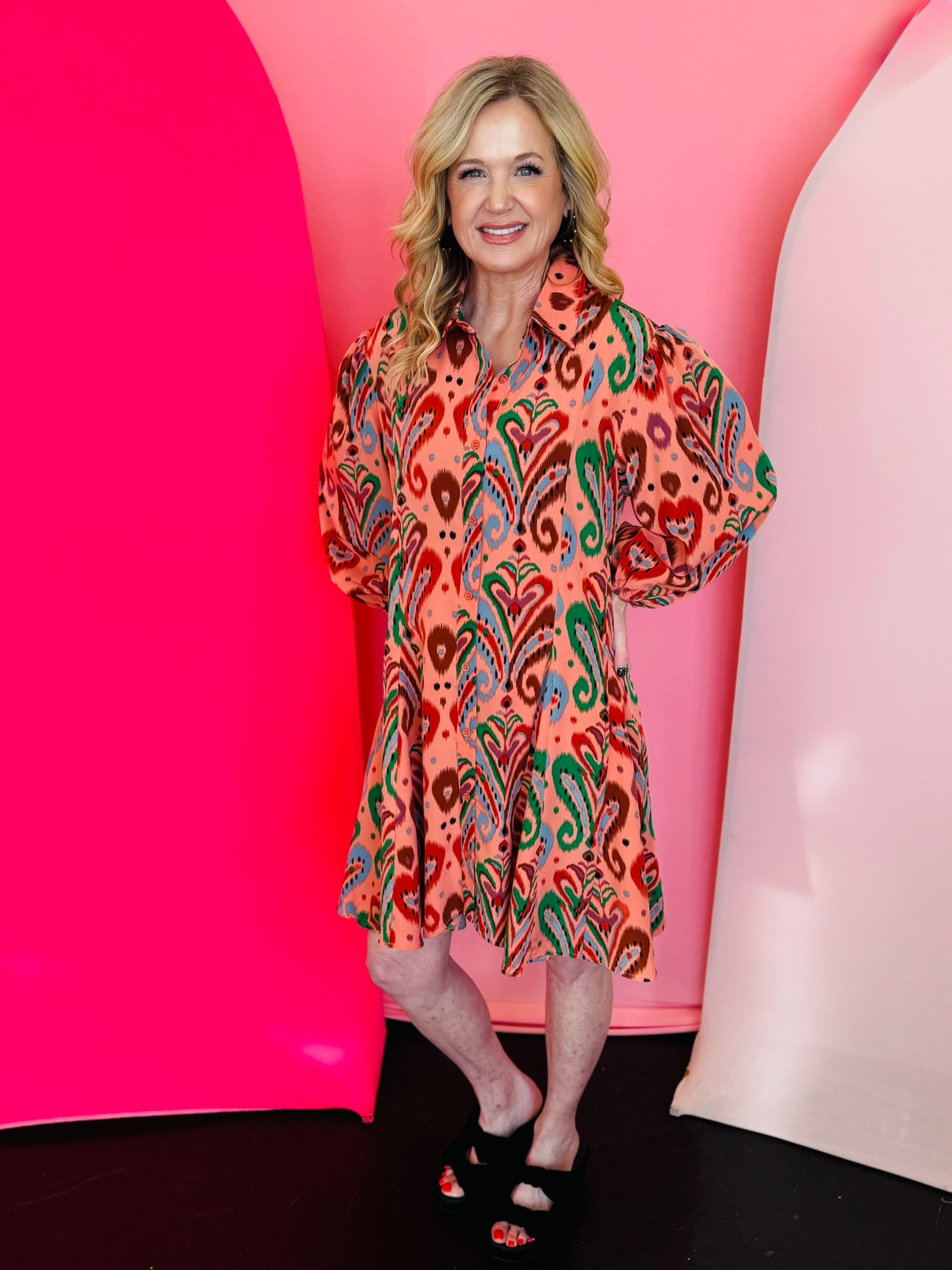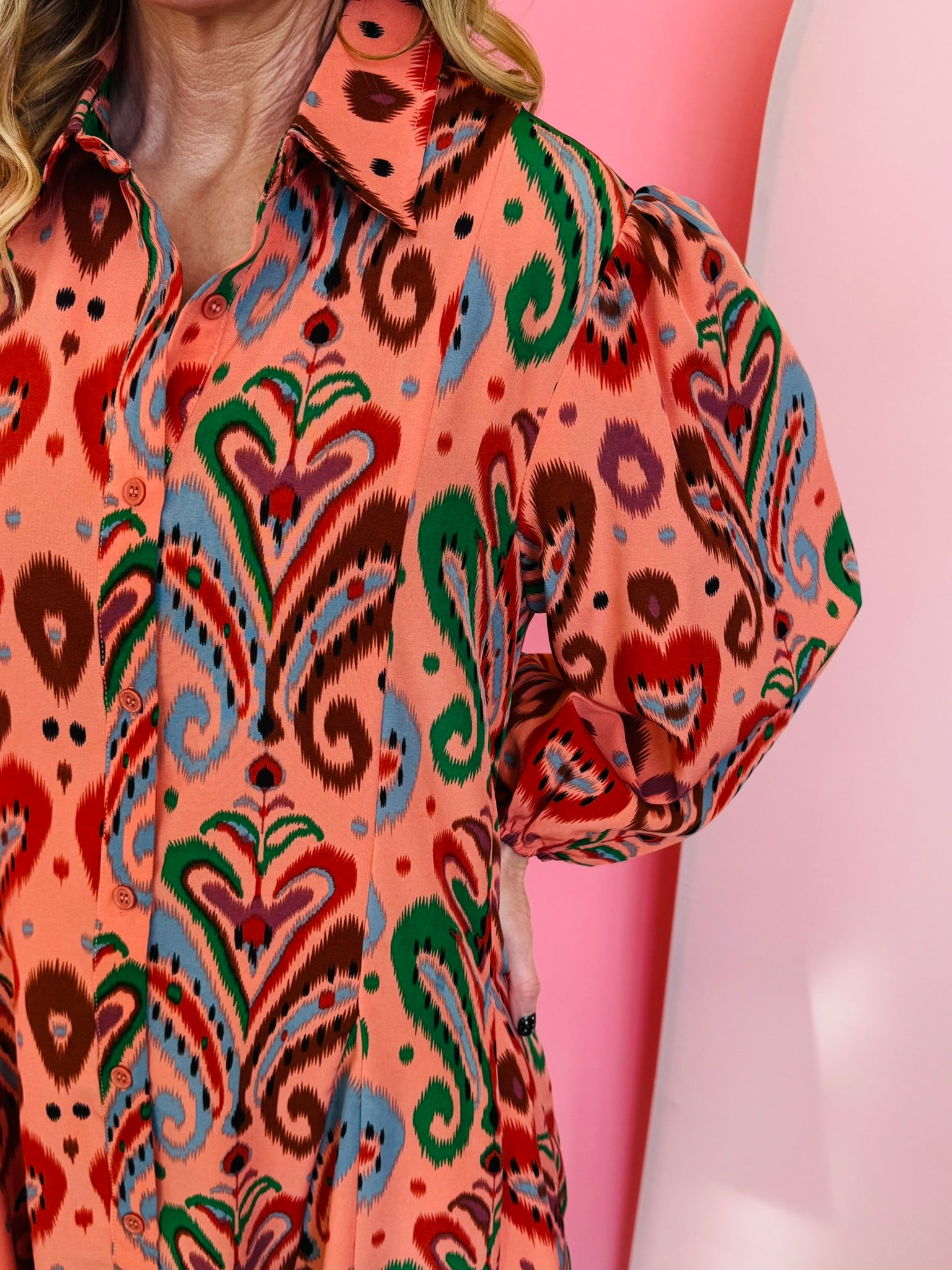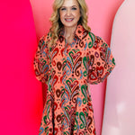 Make a vibrant statement with our Peach Paisley Dress, a bold and breezy button-down shirt dress designed for effortless style and standout appeal. Crafted from lightweight 100% polyester, this dress features a bright, swirling paisley print with lively pops of green, blue, and rust that create a playful yet polished look. The relaxed swing-fit silhouette offers easy movement and all-day comfort, while the long puff sleeves add feminine volume and a touch of boutique elegance. A full button-down front enhances versatility, allowing you to wear it as a dress, style it open as a layering piece, or belt it for added shape. Perfect for brunch, travel, seasonal events, or everyday chic, this paisley dress brings joyful color and modern charm to any wardrobe.