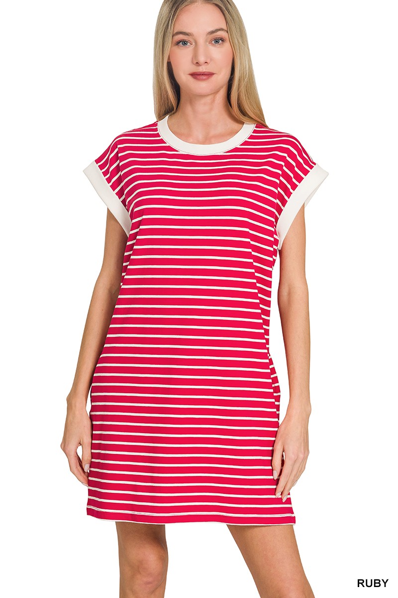 Bold, classic, and effortlessly comfortable, the Red Striped Tee Dress is your go-to for easy everyday style. Featuring vibrant red and white horizontal stripes, this casual t-shirt dress brings a fresh pop of color while maintaining a timeless look. The contrast neckline and cuffed cap sleeves add a crisp, polished detail that elevates the relaxed silhouette.