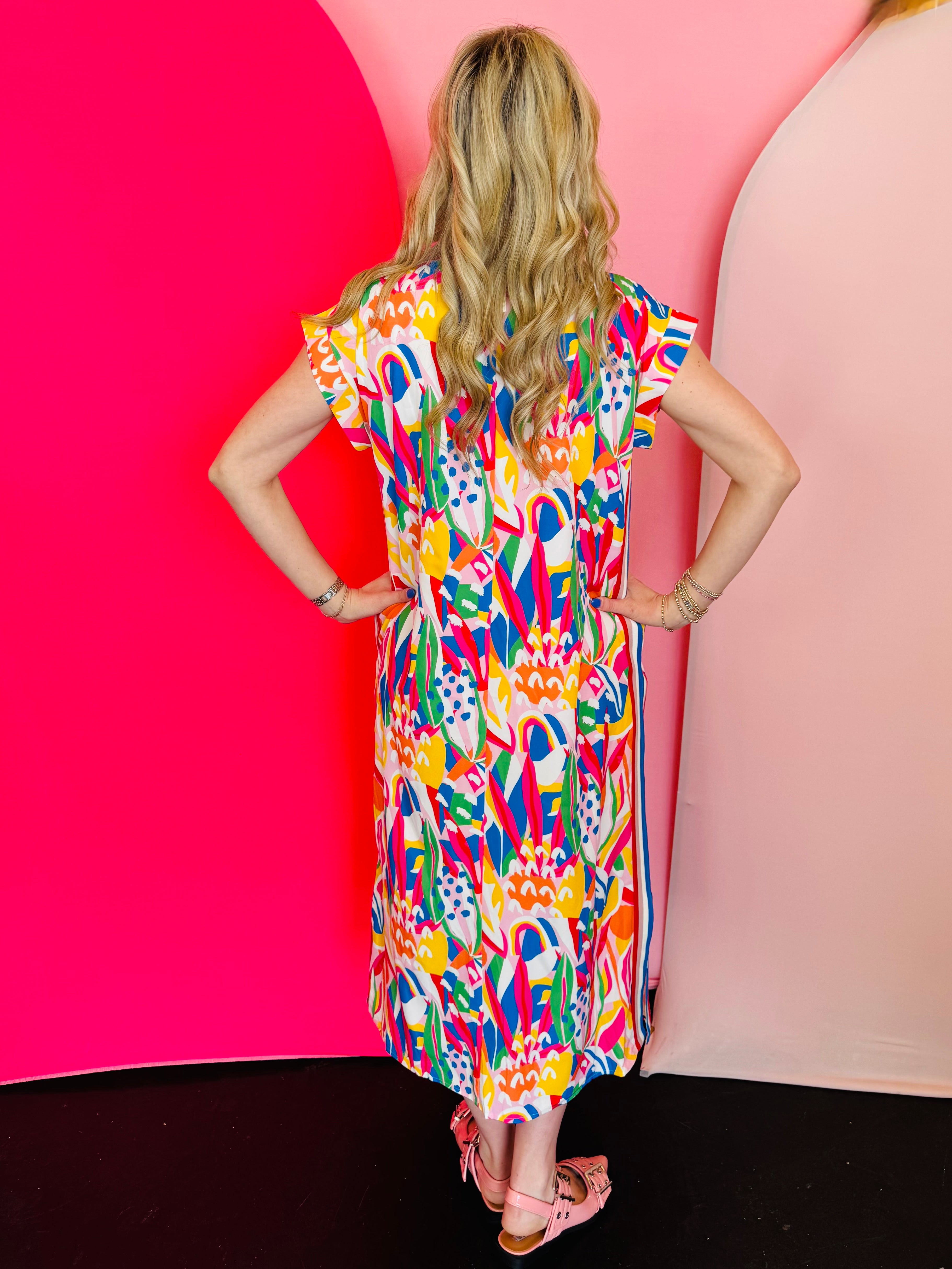 Thoughtful details elevate this midi from casual to standout, including the sporty color band trim along the neckline and sides for a modern touch. Functional side pockets add convenience without sacrificing style, and a subtle side slit allows for easy movement and an effortless flow. Whether you’re heading on vacation, attending a casual event, or simply want a feel-good outfit, the Sunburst Midi Dress delivers comfort, color, and charm in one easy look.