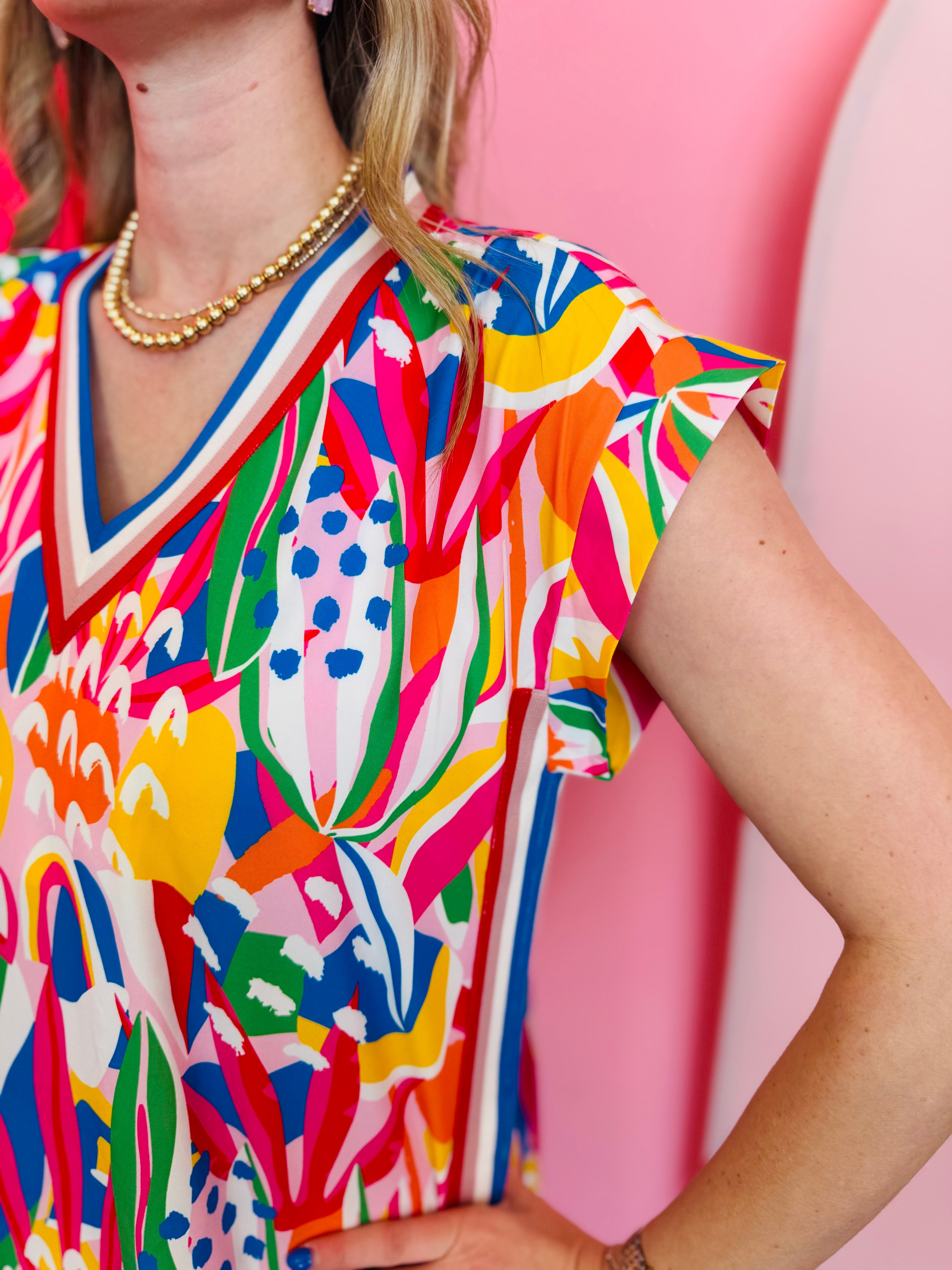 Bright, cheerful, and effortlessly wearable, the Sunburst Midi Dress is your go-to piece for adding color and confidence to your everyday wardrobe. Designed with a vibrant multicolor geometric print, this dress instantly brings a happy, sun-kissed feel that’s perfect for spring and summer days. The relaxed drop-shoulder silhouette offers an easy, flattering fit, while the soft stretch fabric keeps you comfortable from morning errands to evening plans.
