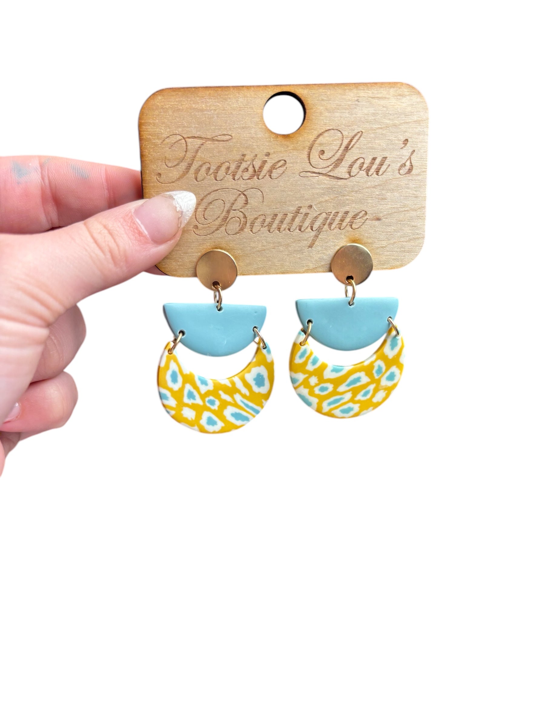 Add a pop of color and edge to any outfit with these mustard and teal acrylic moon dangle earrings. Their lightweight design ensures comfort while the gold stud adds a touch of elegance. Fierce yet fine, these earrings are perfect for any trendsetter.
