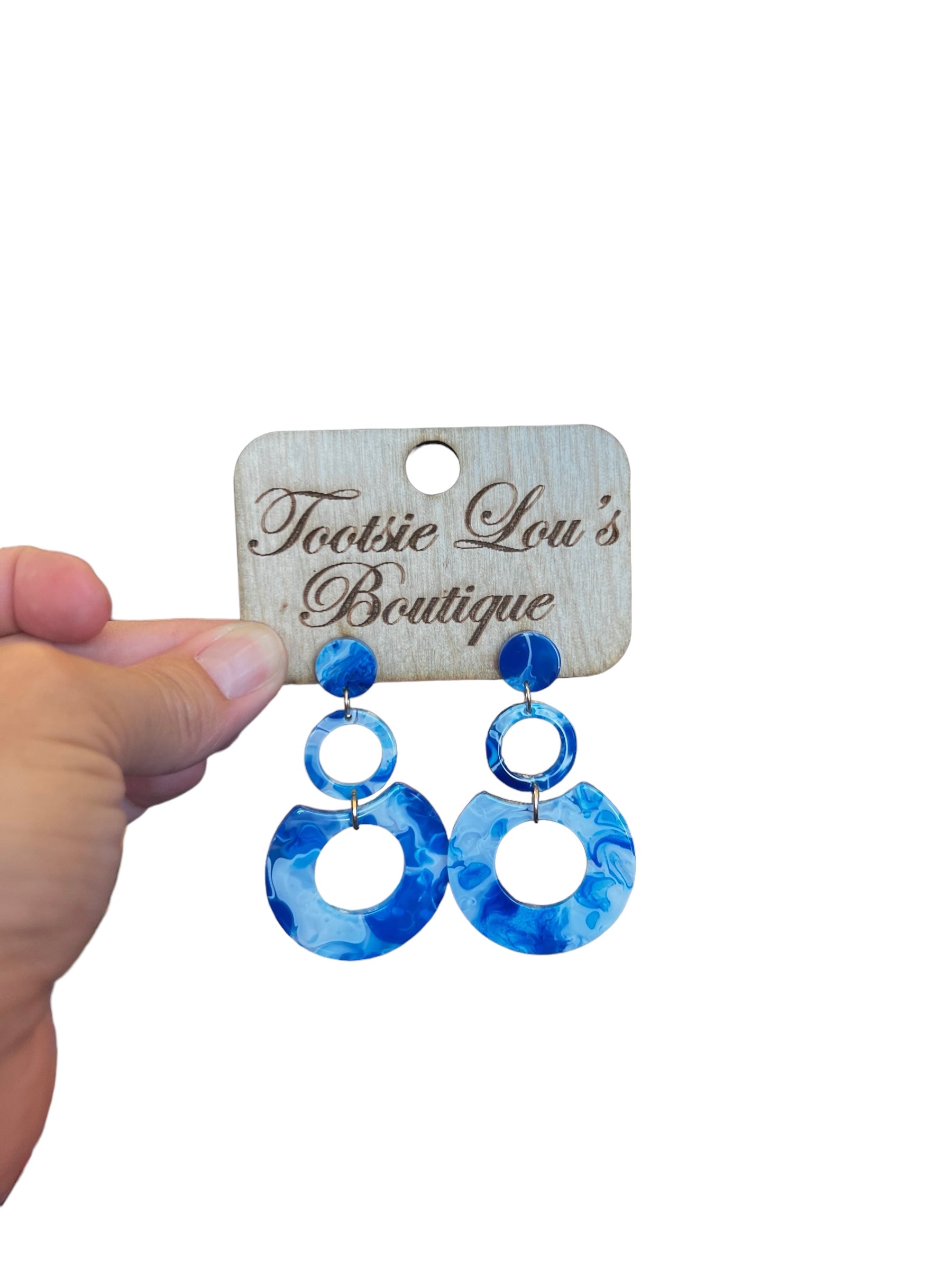 Add a pop of color to your outfit with our Blue and White Acrylic Dangles. These playful earrings are sure to make a statement and bring a touch of whimsy to any look. Perfect for any fun-loving fashionista!