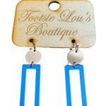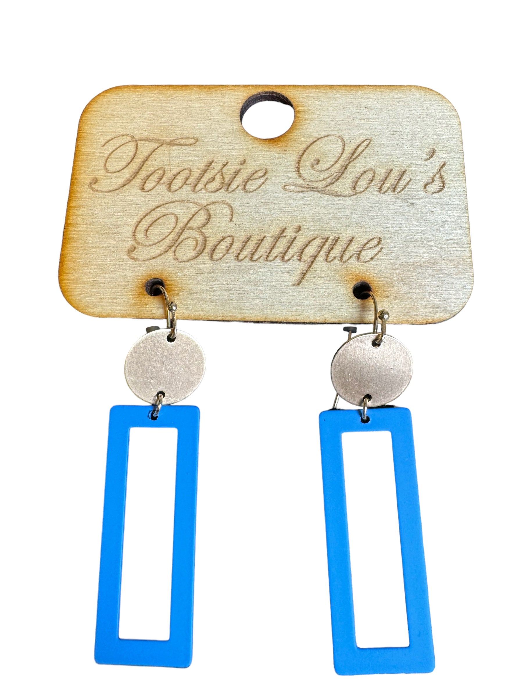 Add a pop of color to your outfit with these Blue Rectangle Dangle Earrings! Featuring a unique dangle design and accented with gold, these earrings are perfect for adding a touch of fun and playfulness to your look. Get ready to turn heads with this quirky accessory!