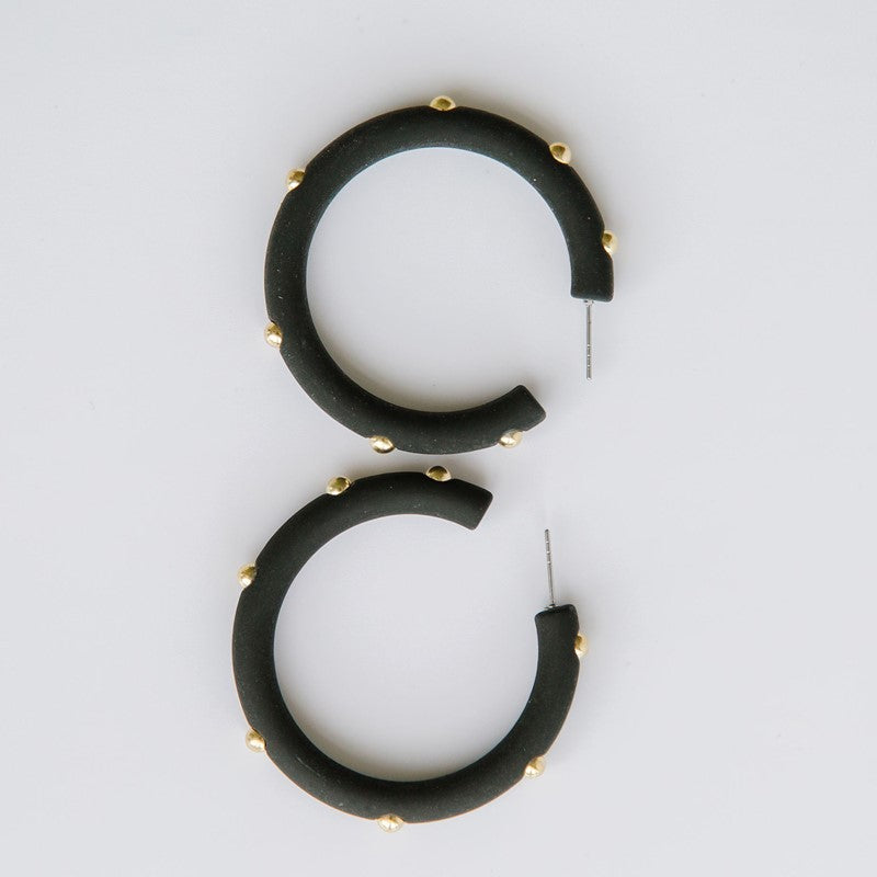 Add a touch of elegance to any ensemble with the Candace Large Black Earrings. These stunning black hoop earrings feature delicate gold stud accents and are made of lightweight acrylic for all-day comfort. Elevate your look and make a statement with these stylish earrings.