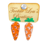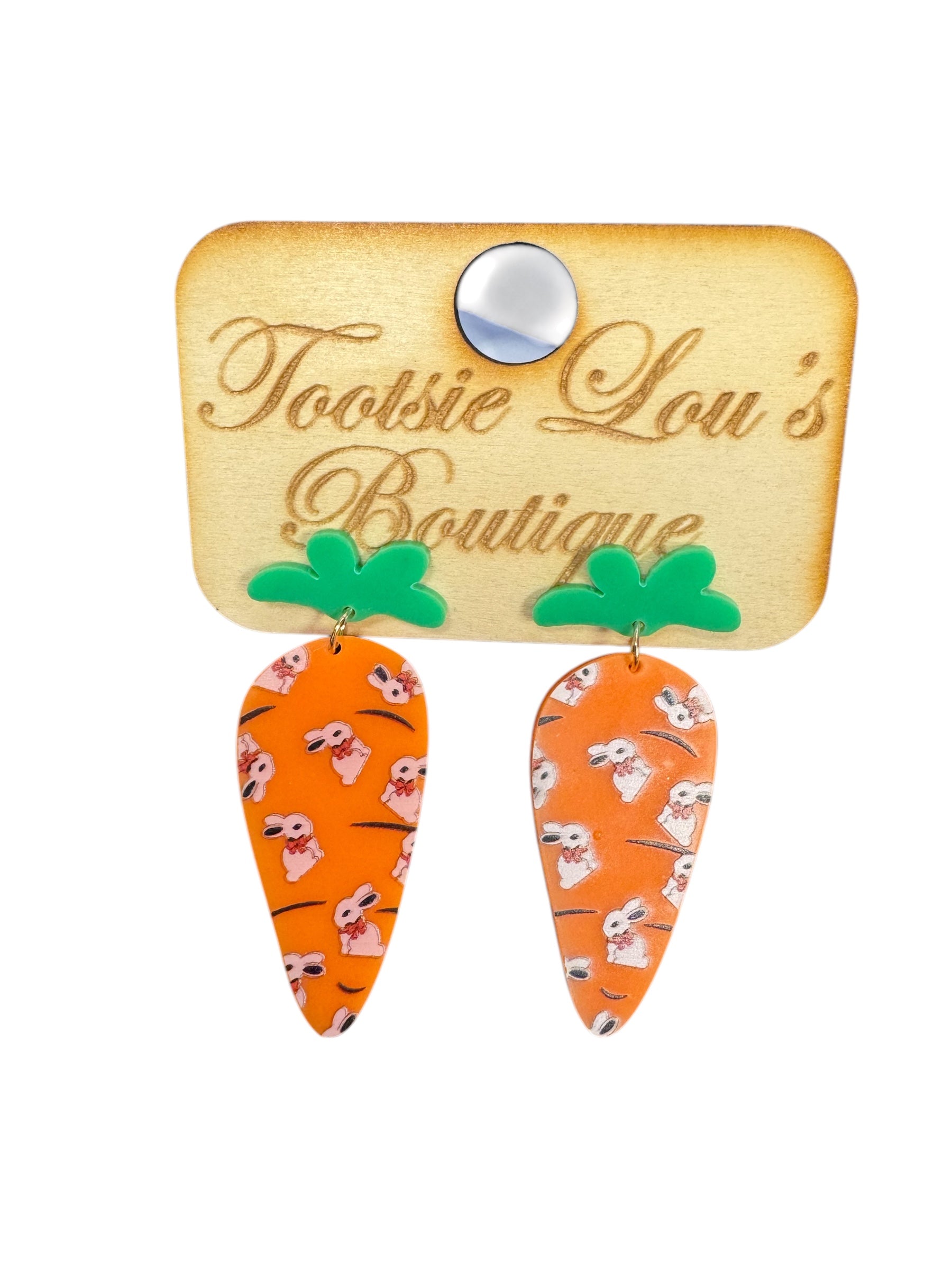 Bunny-ful earrings! These playful Carrot Dangle Earrings feature vibrant orange and green acrylic with a cute bunny imprint. Perfect for adding a touch of whimsy to any outfit. Hop to it and add these to your collection!