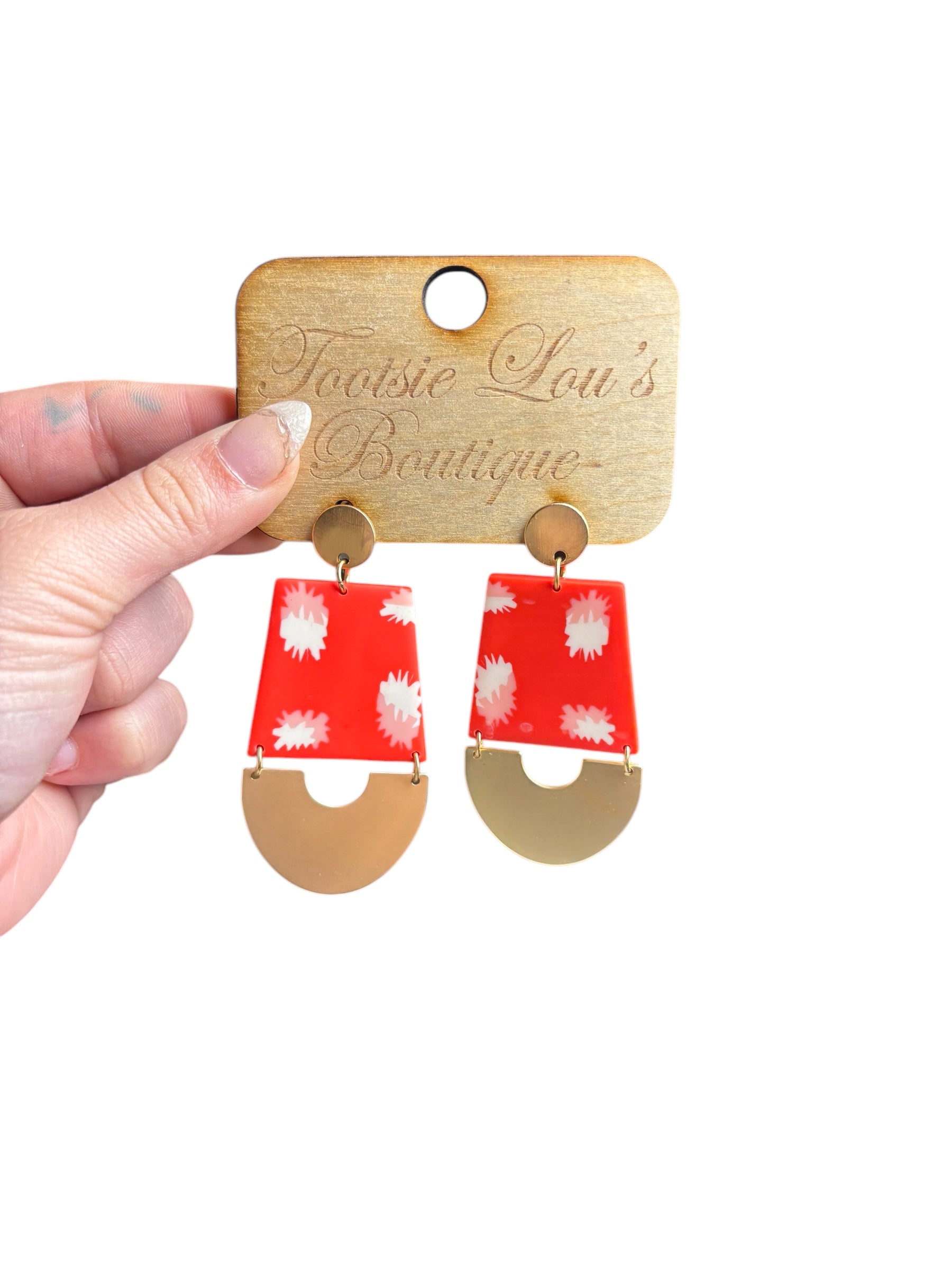 Add a fun pop of color with the Elyse Rough Runner Red Earrings. These quirky earrings feature a gold half circle dangle on a bold red and white acrylic set, complete with a gold stud. Perfect for adding a playful touch to any outfit!