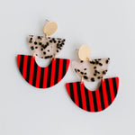 Introducing the exquisite Emorie Red/Black Earrings, a fusion of bold patterns and elegant design. Half circle clear leopard rests on a half moon of red and black stripes, suspended from a round gold post. Elevate your style with these luxurious and sophisticated earrings.