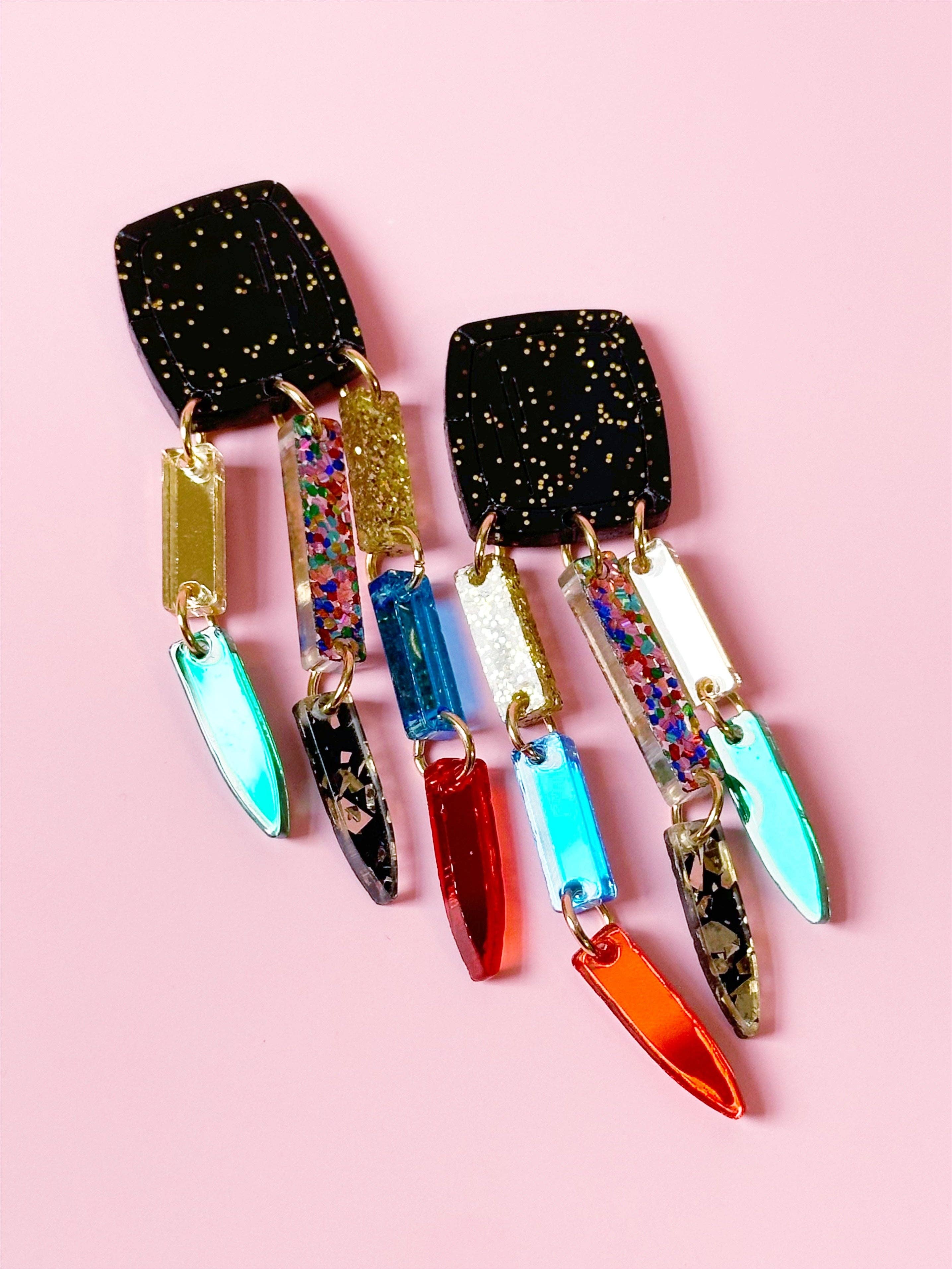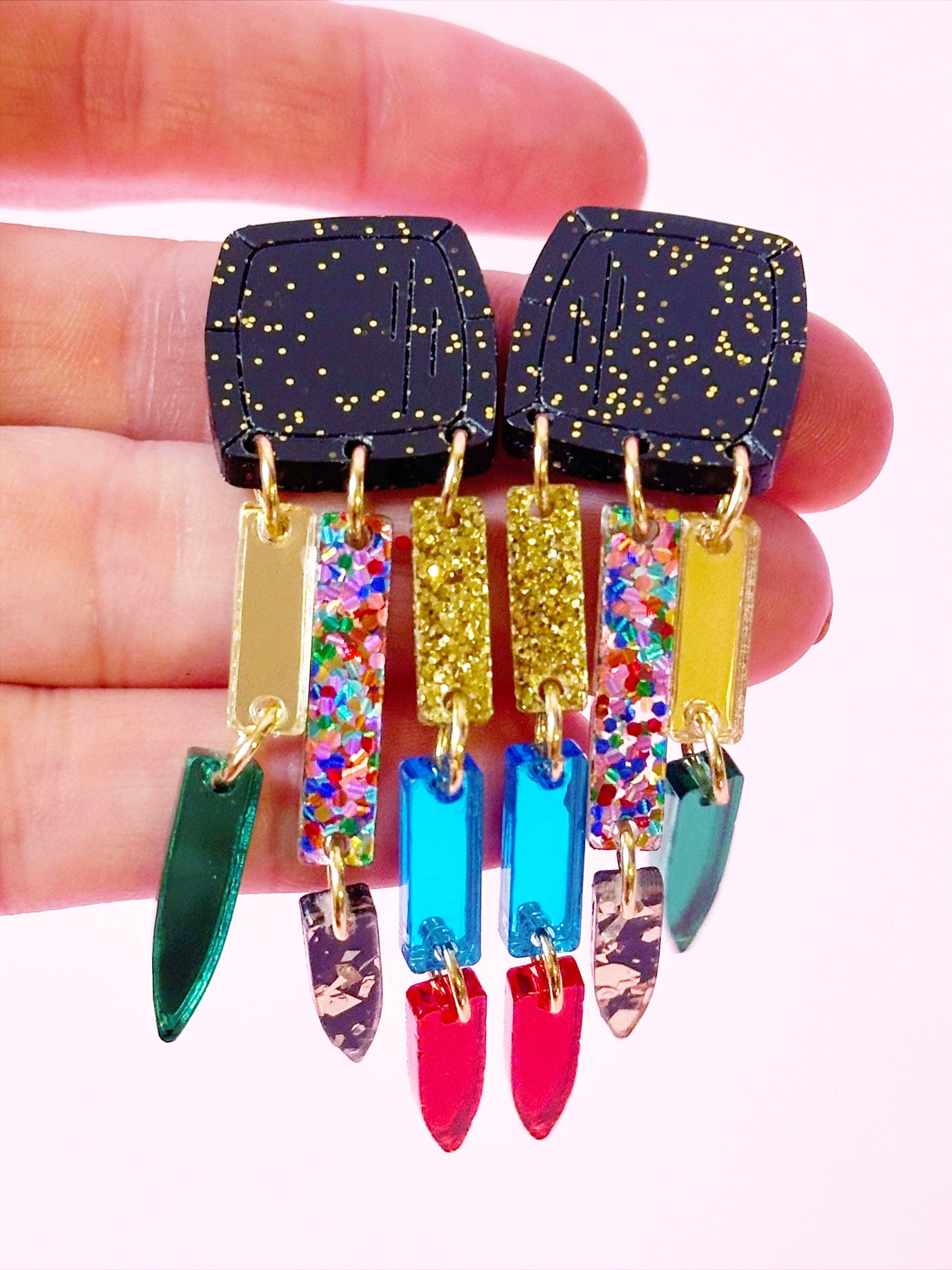 Make a bold, art-inspired statement with these eye-catching acrylic dangle earrings. Designed to turn heads, each pair features a vibrant mix of gold, green, red, blue, and multi-colored confetti that feels playful yet polished. The sparkling black tops add striking contrast and extra shine, perfectly balancing the colorful dangles below. As they move, the confetti details catch the light beautifully, creating a dazzling effect that elevates any outfit—from casual denim to dressy looks.