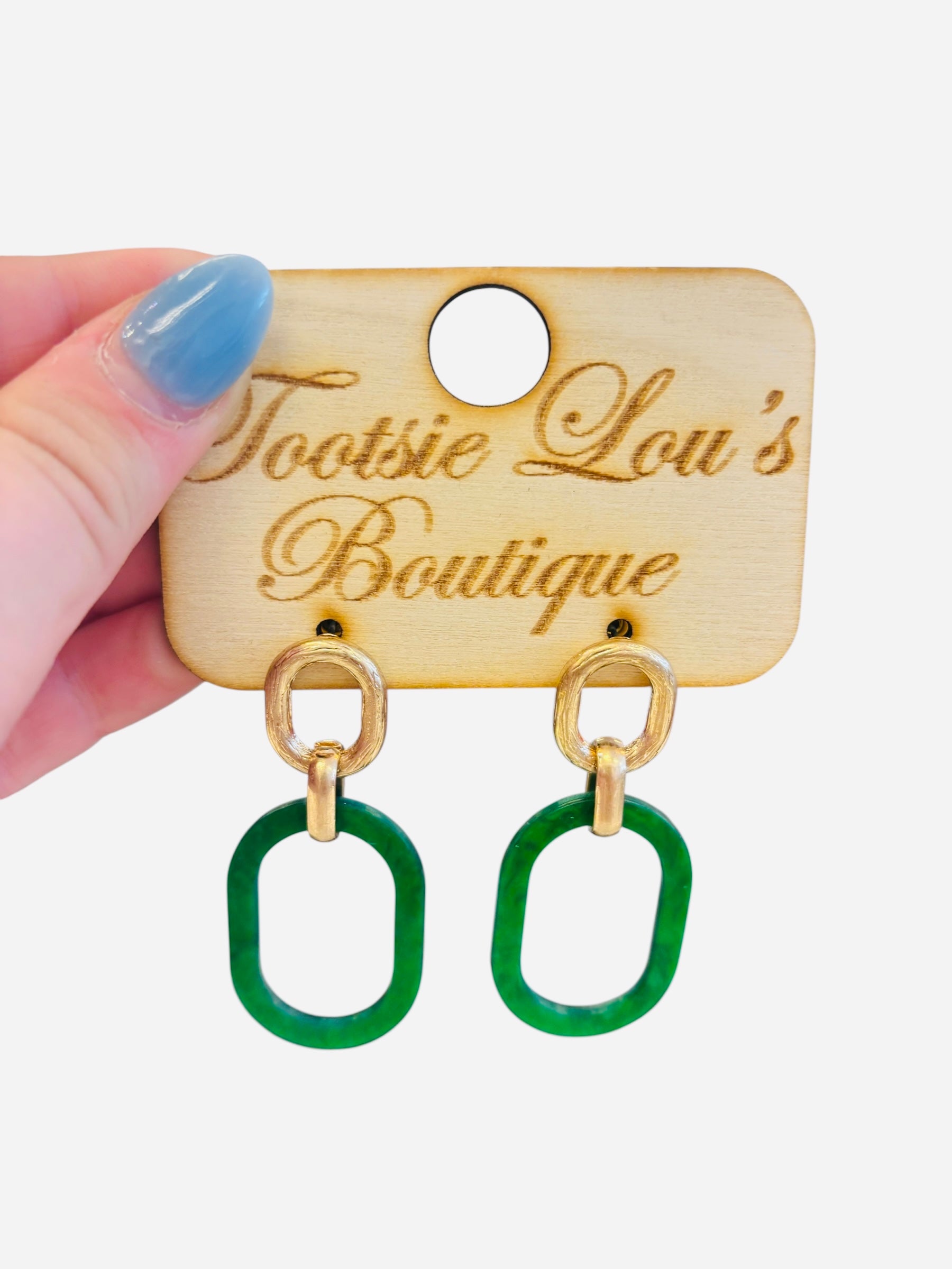 These refined earrings feature a small gold oblong stud that elegantly drops down to a larger green oblong acrylic pendant. Their sleek design and harmonious color pairing offer a sophisticated touch, perfect for enhancing any elegant outfit.