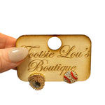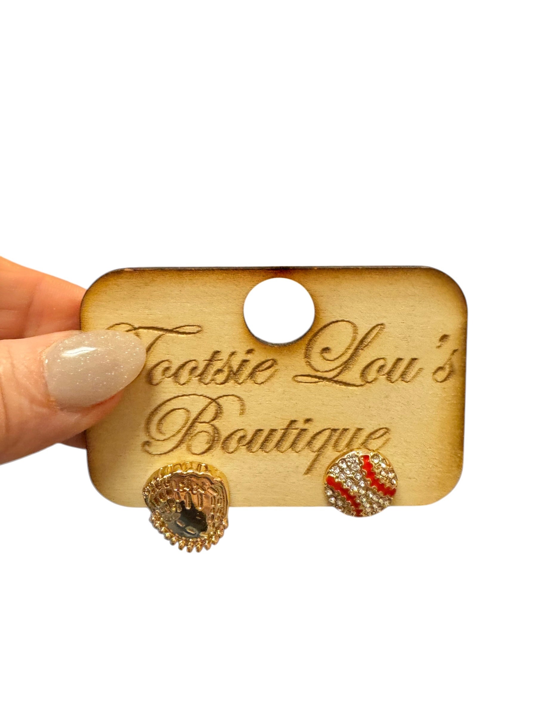 Add some sparkle and fun to your wardrobe with these Gold Mitt & Rhinestone Baseball Studs. The perfect accessory for baseball lovers and fashion enthusiasts alike. Score a home run with these unique and eye-catching studs. (Fashion tip: Pair them with a game day tee and jeans for a sporty chic look!)