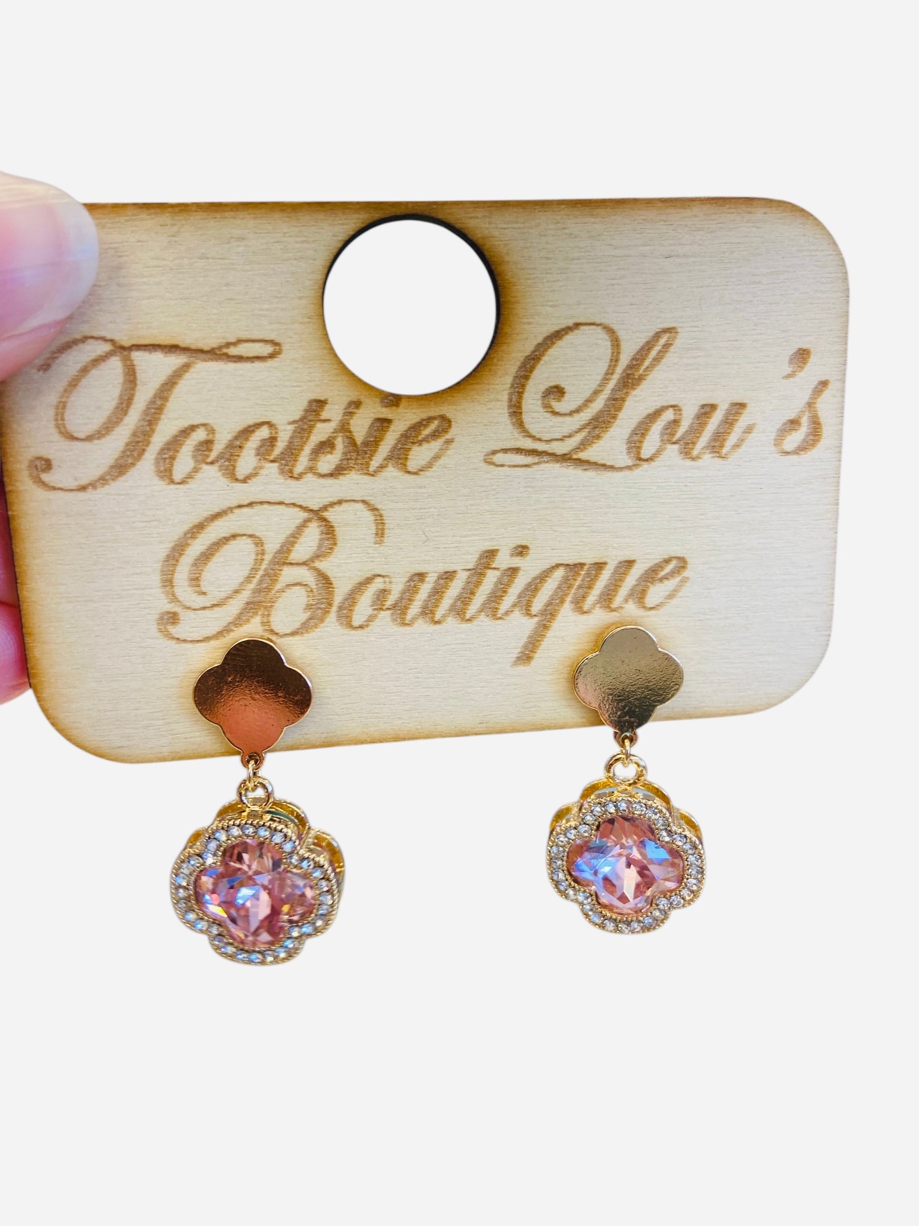 This elegant gold clover pendant features a delicate pink crystal clover that gracefully drops below, surrounded by a halo of tiny shimmering crystals. Its refined design adds a subtle touch of sophistication, perfect for elevating any outfit with understated charm.