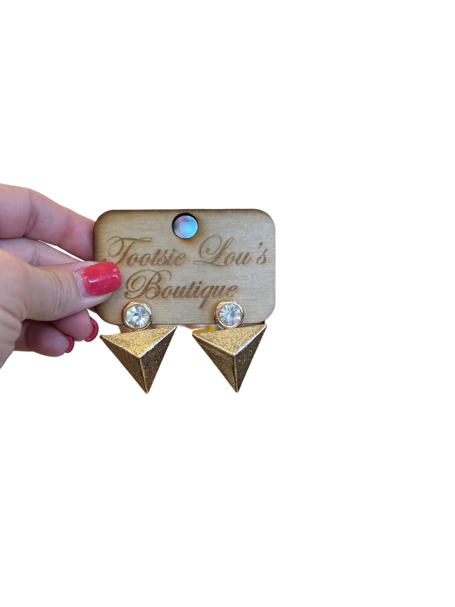 Add some shine to your wardrobe with these Gold Pyramid Earrings! The crystal studs add an extra touch of elegance to these already eye-catching accessories. You'll be the talk of the town (or at least your friends) with these unique and playful earrings.