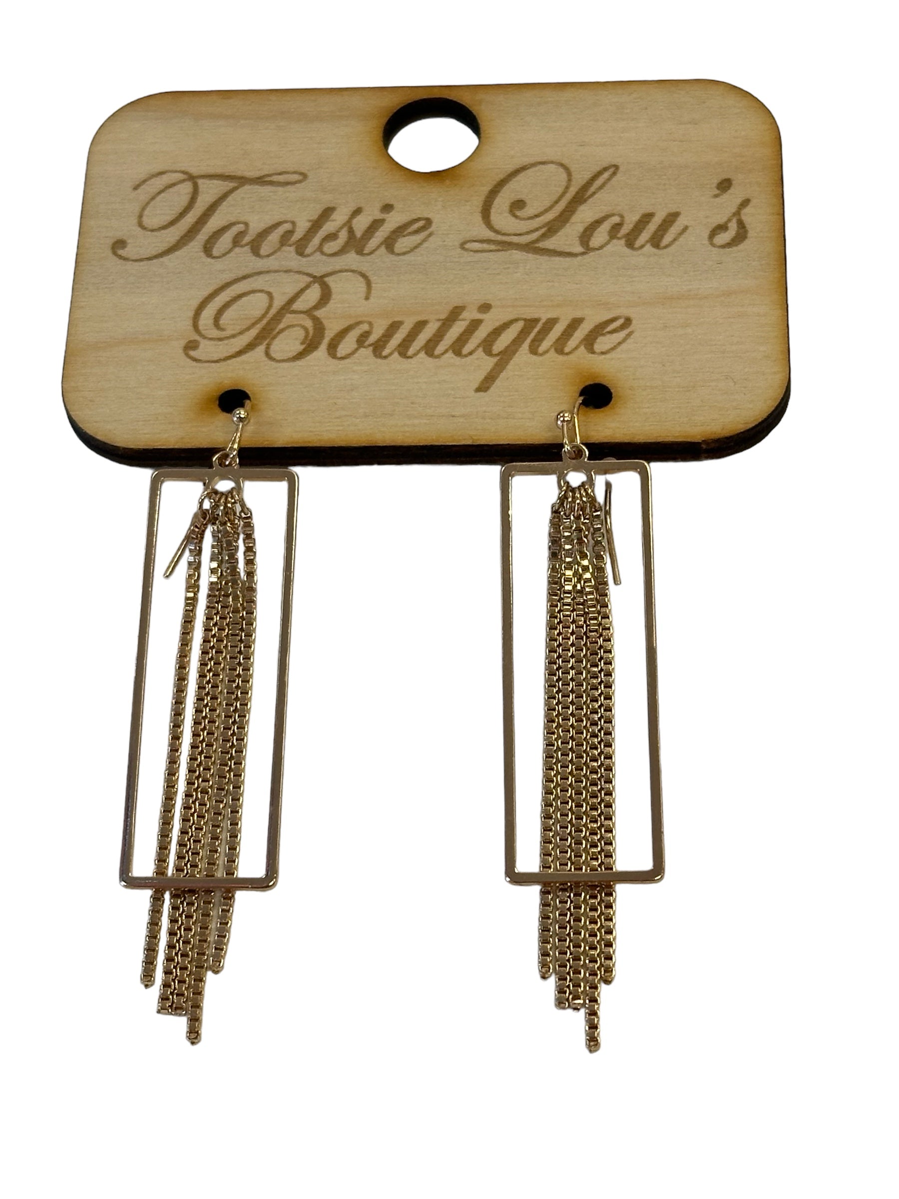 Indulge in the subtle luxury of these Gold Rectangle Earrings. Crafted with precision, the rectangular shape brings a touch of modern elegance. The delicate gold tassels add movement to your look, while the dangling design creates a sophisticated silhouette. Elevate your style with these timeless earrings.