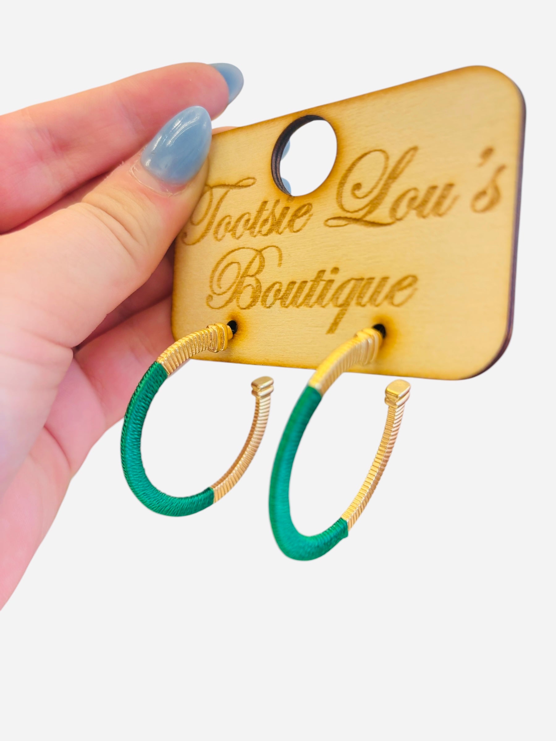 These 1.5-inch hoop earrings feature a sophisticated blend of half gold and half green twine design, offering a unique twist on a classic accessory. Their elegant contrast adds a refined touch to any outfit, perfect for elevating your everyday style or complementing special occasions.