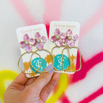 Elevate your style with our Jenna Pink Sequin Flower Hoop Earrings. Crafted with pastel pink sequin flowers and hammered gold round dangles, these earrings exude opulence and refinement. Perfect for adding a touch of femininity and luxury to any outfit.