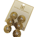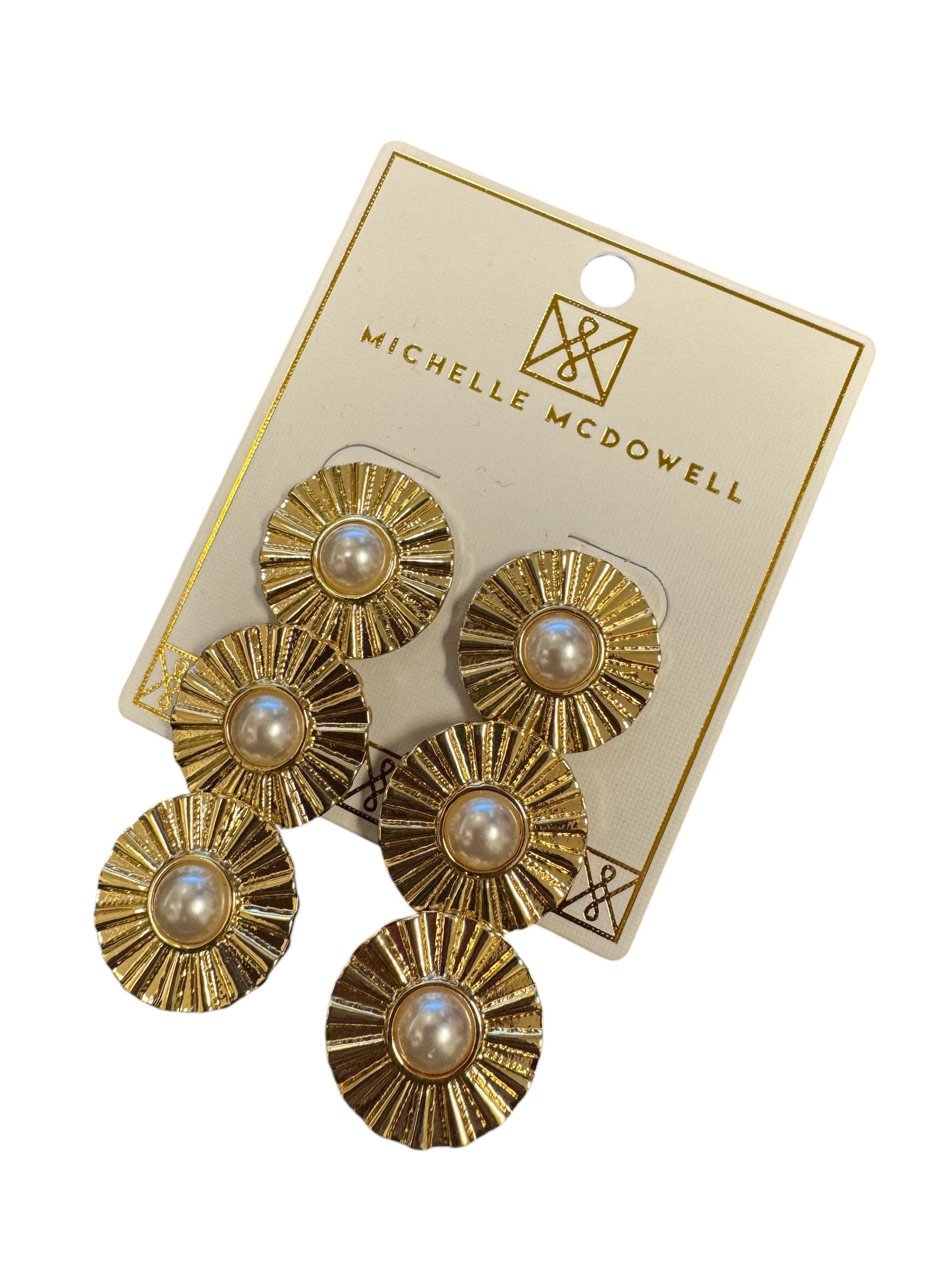 Effortlessly elevate your look with our Kai Gold & Pearl Earrings. These elegant earrings feature a trio of shimmering gold sunburst discs accented with a lustrous pearl. Measuring at 2.5 inches in length, they are the perfect statement piece for any occasion. Embrace opulence with these exquisite earrings.