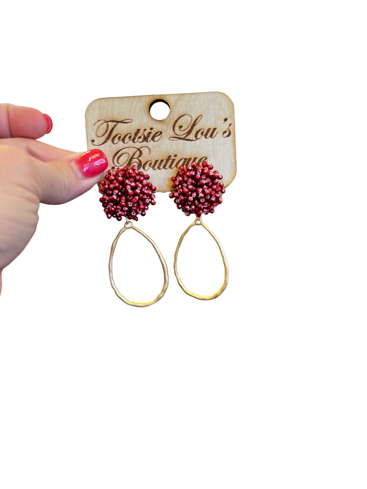 Shake up your earring game with our Maroon Beaded Cluster Dangles! These gold teardrop earrings feature a fun and playful maroon beaded cluster, adding a touch of personality to any outfit. Dangle them from your ears and let your unique style shine.