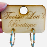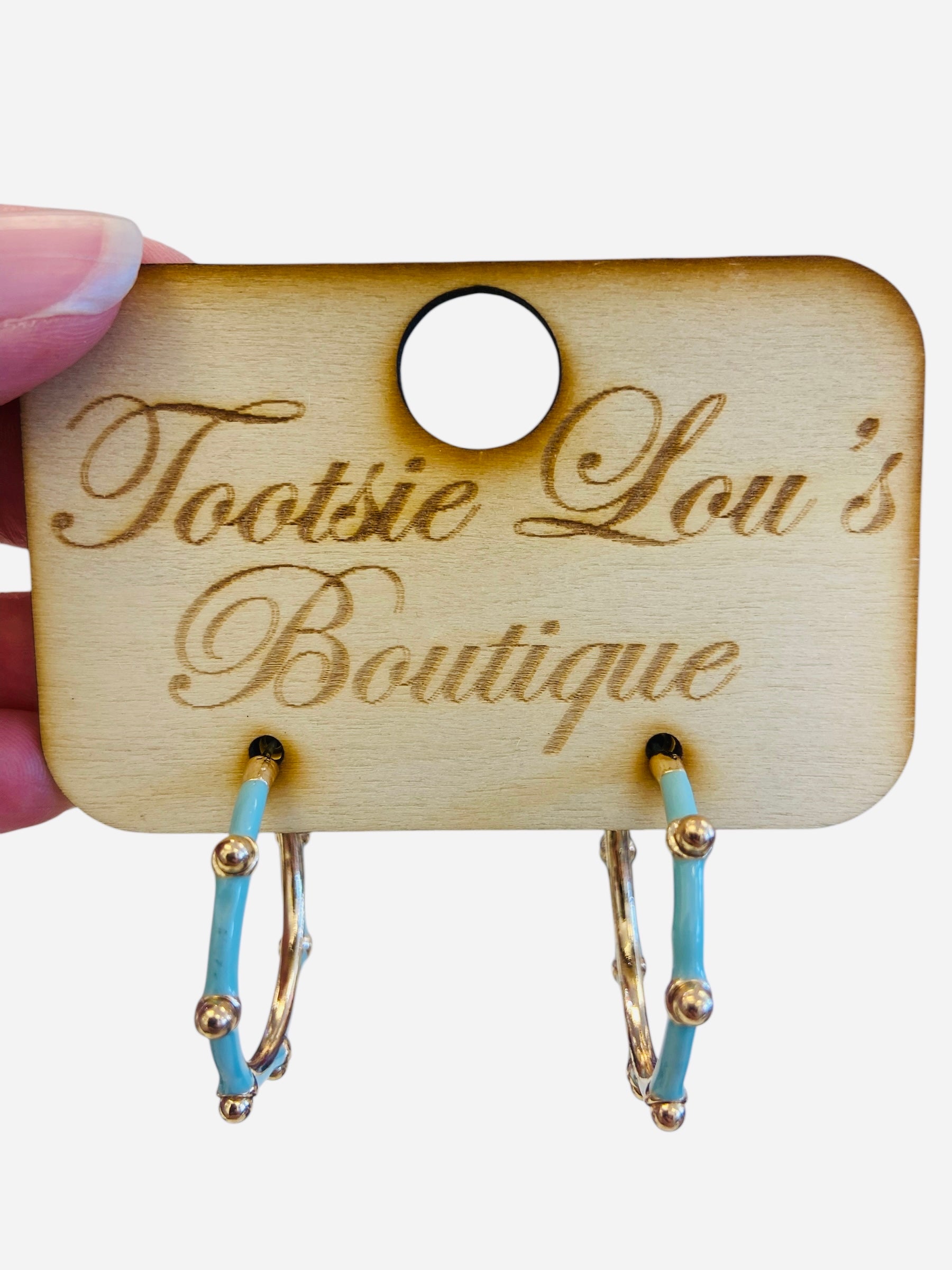 These playful gold hoops feature a vibrant mint coated metal circle measuring 1 inch, accented with shiny gold studs. They’re the perfect statement accessory to add a fun and colorful twist to any outfit.