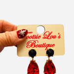 Make a bold entrance with our Orange Teardrop Rhinestone Dangle Earrings, a stunning statement piece designed to turn heads the moment you walk in. These dramatic earrings feature an oversized faceted orange teardrop rhinestone that catches the light beautifully, creating dazzling movement with every step. The teardrop dangle is anchored by a striking large black rhinestone stud, adding contrast, depth, and a touch of modern edge to the design. Together, the vibrant orange and sleek black stones create a glamorous, eye-catching look perfect for game days, concerts, holiday parties, or any moment you want to stand out. Lightweight enough for comfortable wear but bold enough to make an impact, these earrings bring show-stopping sparkle to any outfit.