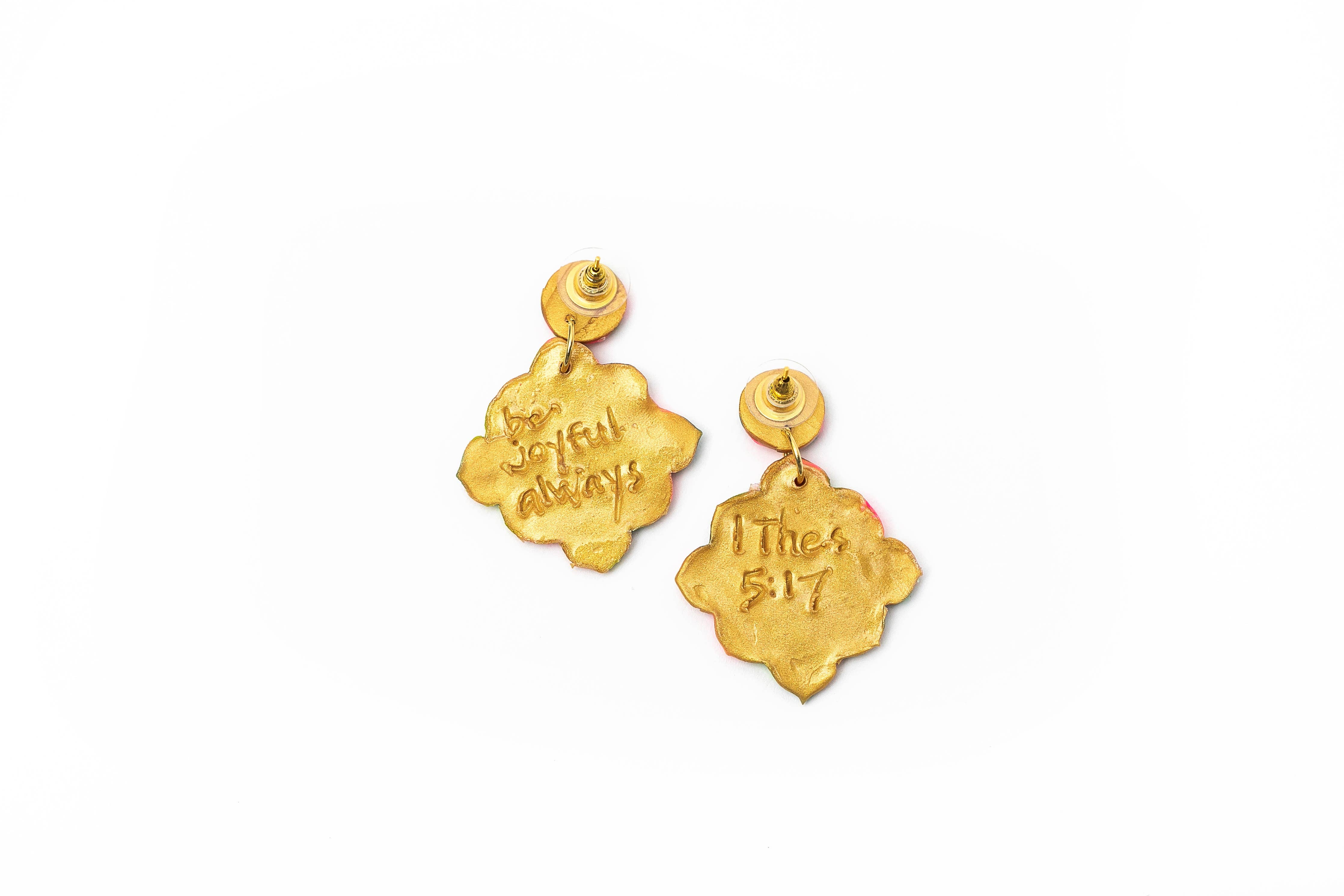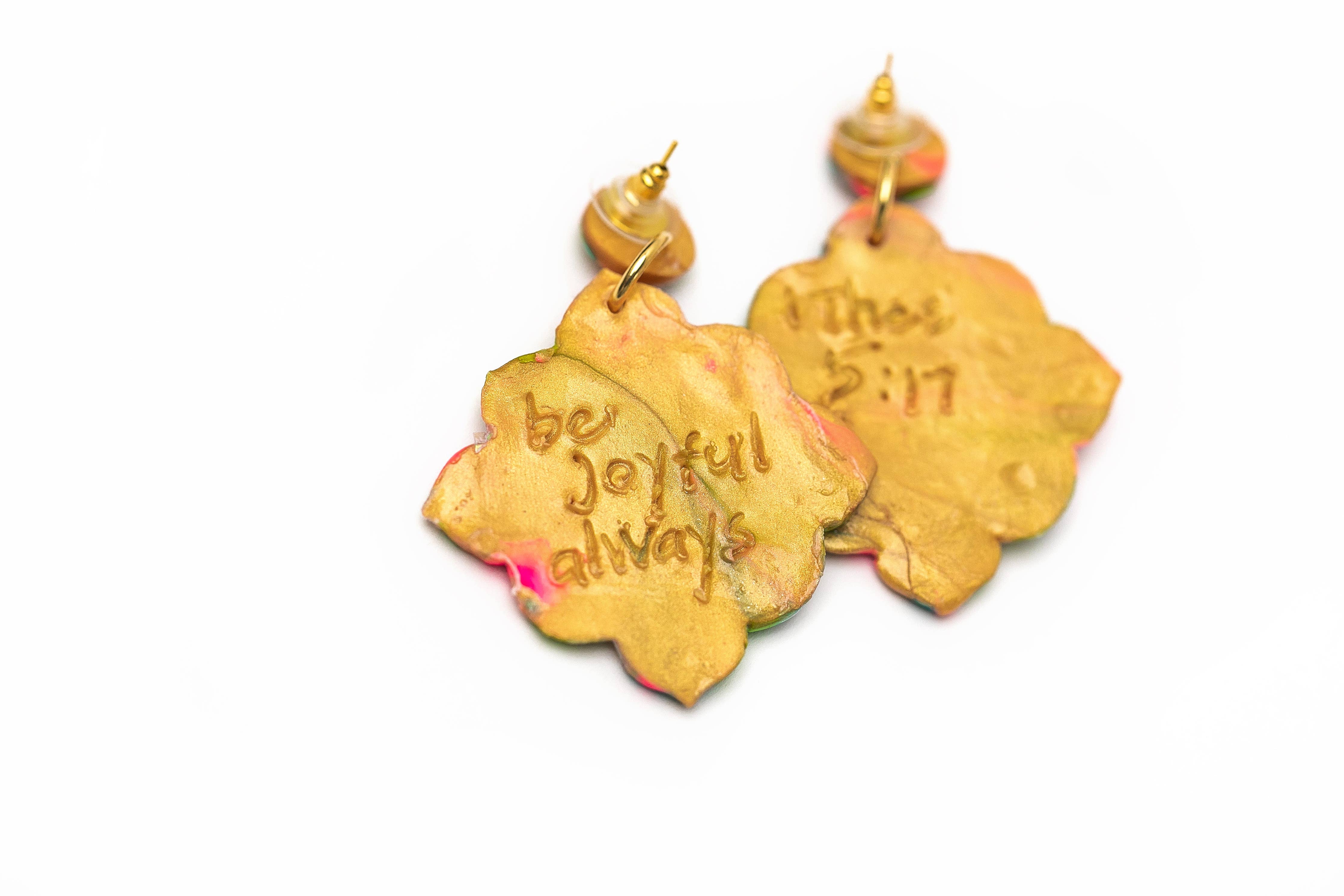 Get ready to add some joyful bling to your outfit with these Pink, Turquoise & Green Confetti Dangle Earrings! Not only do they make a fun fashion statement, but they also feature a secret scripture on the back (1 Thessalonians 5:17) to remind you to keep that joyful spirit always. Talk about accessorizing with a purpose!