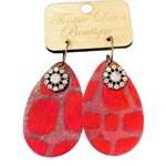 Red embossed hair on hide leather teardrop shaped earrings with rhinestone medallion.
