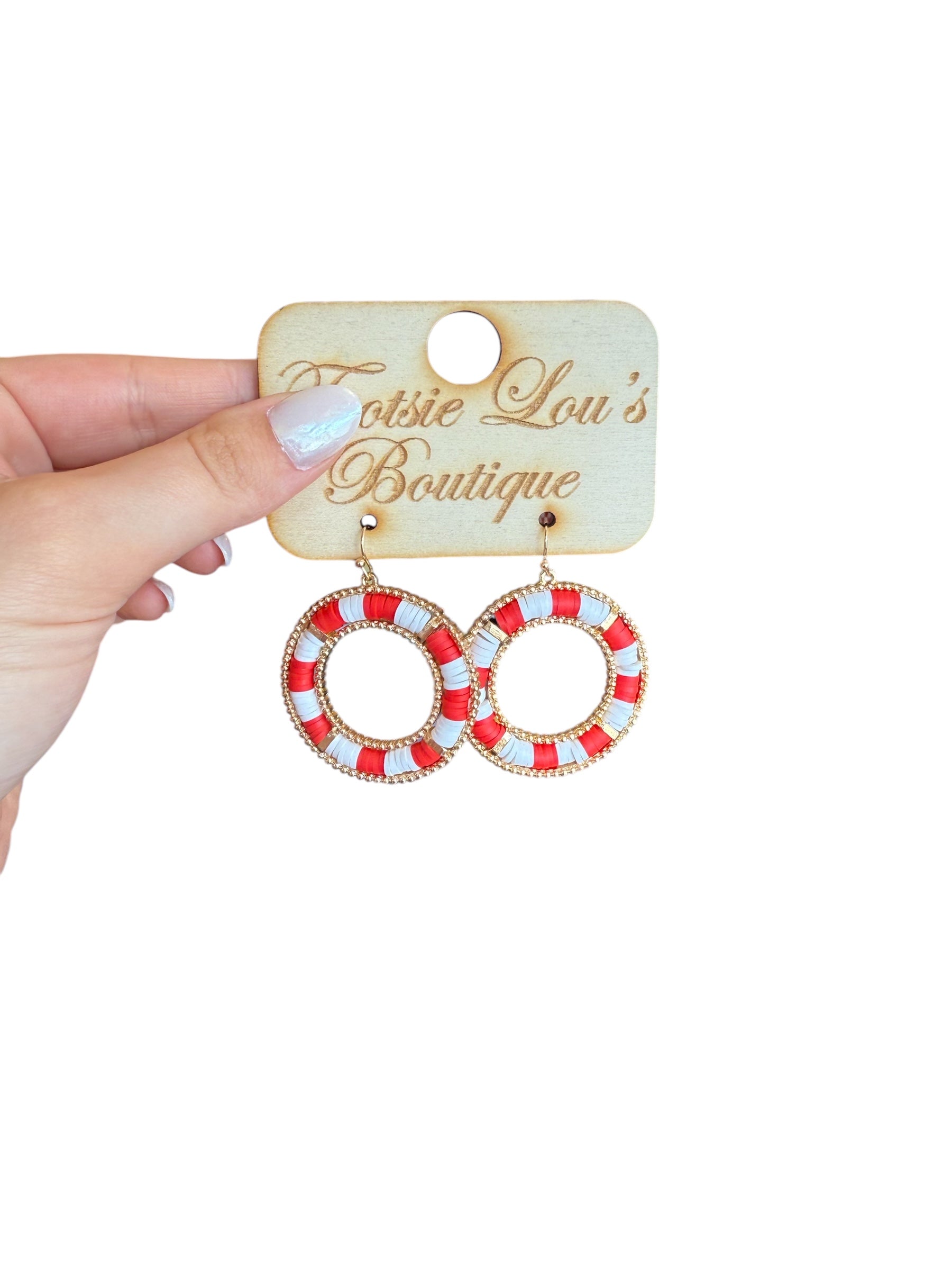 Light up your look with our playful Red Stripe Circle Earring! Featuring Red and white stripe clay beads, topped with a gold circle, these earrings add a touch of fun and style to any outfit. Get ready to turn heads and show off your unique taste with these quirky, must-have earrings!