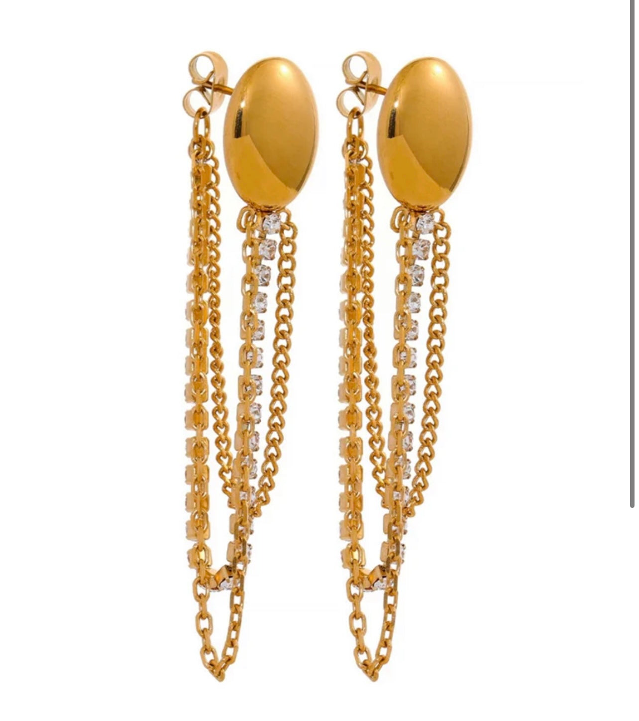 Add some sparkle to your outfit with The Kim Earrings. These gold earrings are adorned with rhinestones, giving them a touch of glamour. Perfect for any occasion, they'll make you stand out and shine!