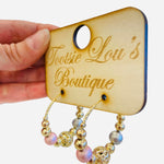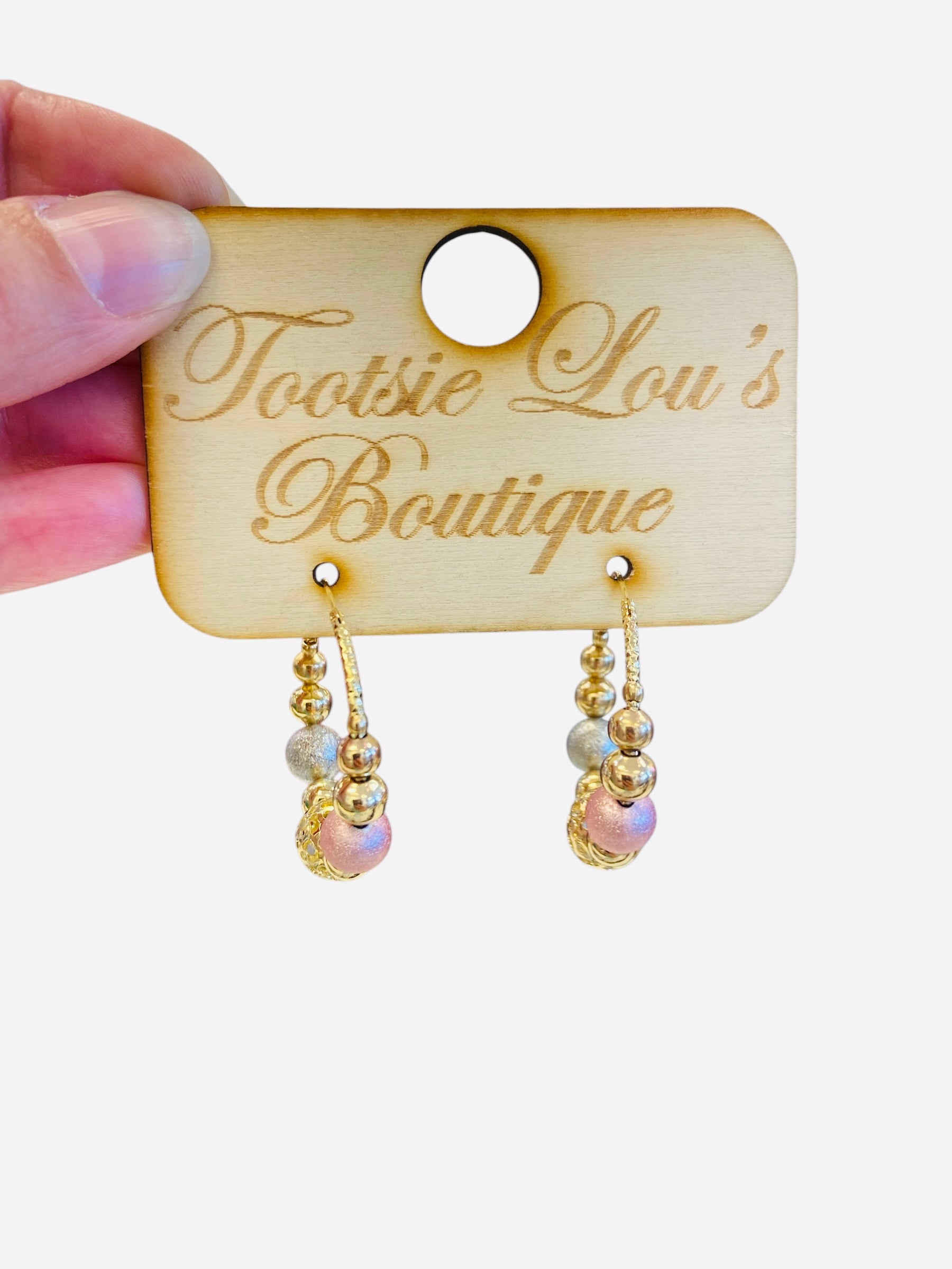 Elevate your elegance with these thin 1.5-inch gold hoops, adorned with a tasteful arrangement of multi-sized balls in gold, light pink, and pastel blue. Their delicate design adds a refined touch to any outfit, perfect for sophisticated everyday wear or special occasions.