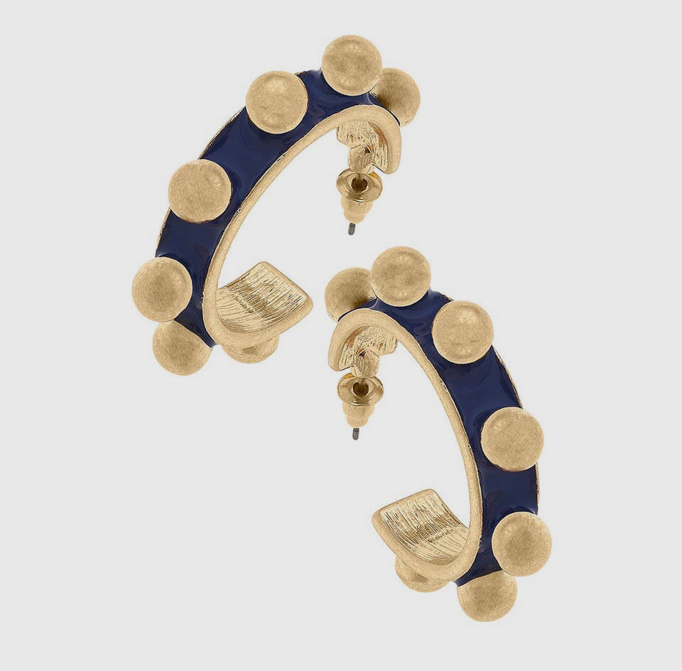 Step out of your comfort zone and take a risk with these blue Jenna Chunky Studded Hoop Earrings. Crafted from durable base metal with a worn gold plating and blue enamel material, they'll become your go-to for a statement look. Dare to stand out and rock these 1.5” length hoops!