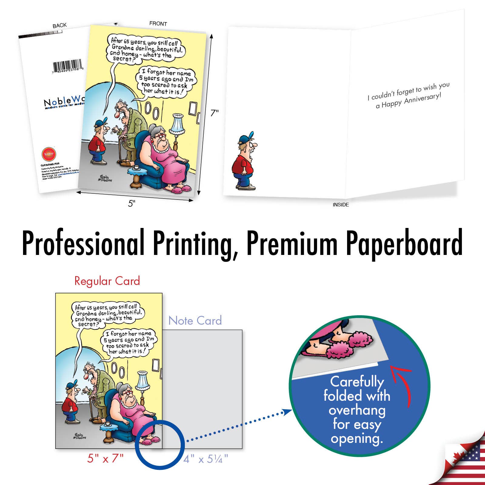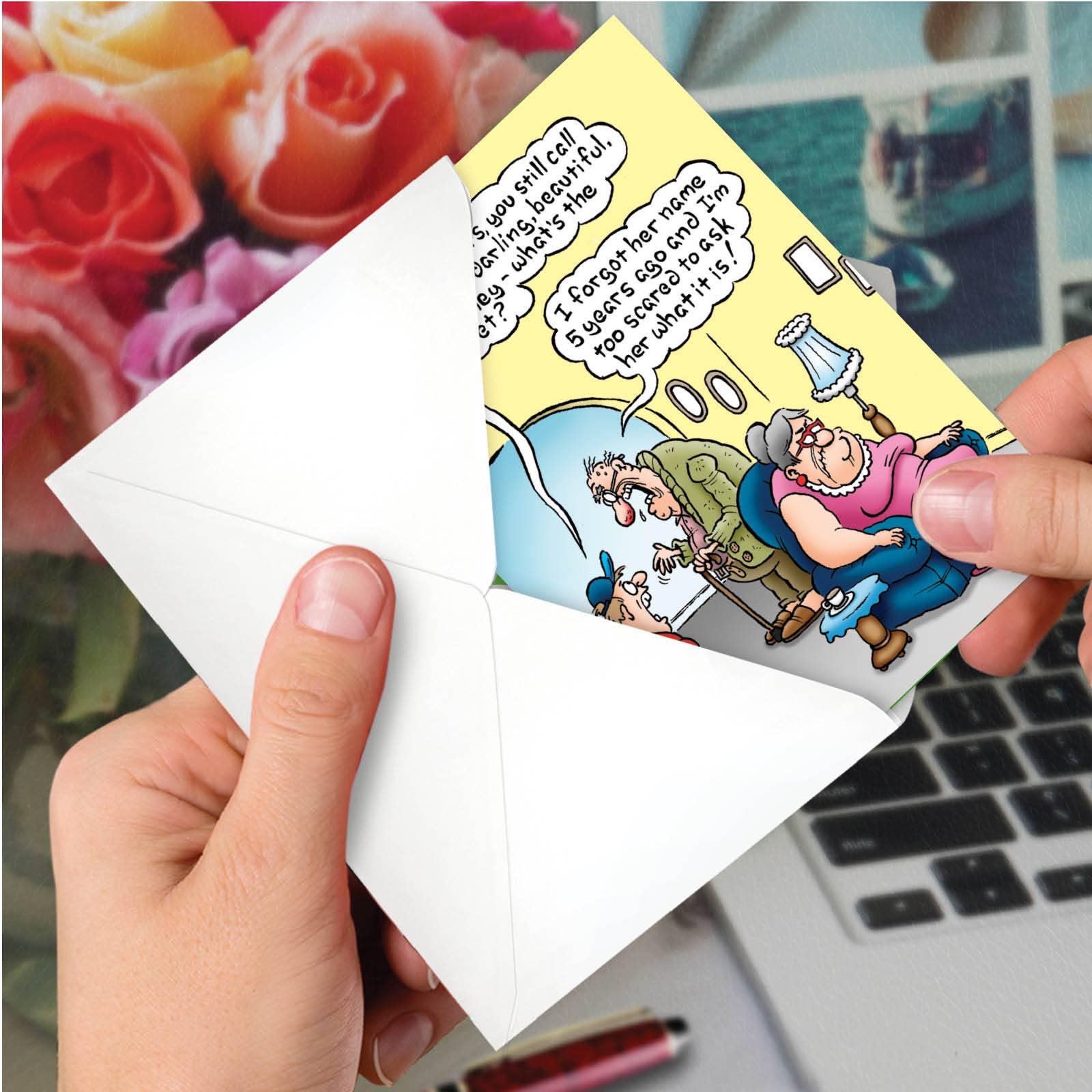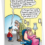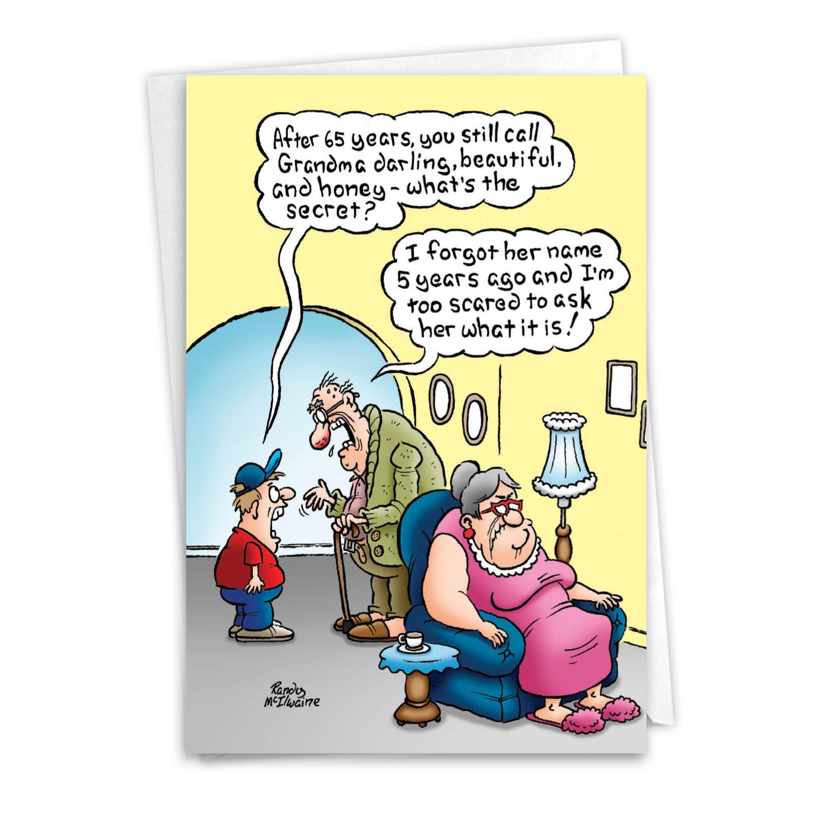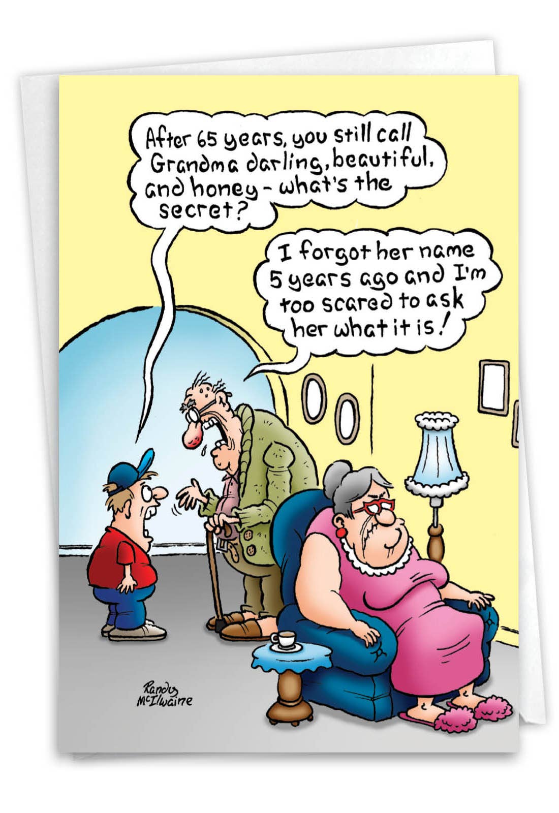 Share a heartwarming laugh with our "Grandma's Name" Anniversary Card, perfect for celebrating a long and happy marriage. The front features a sweet and funny joke: After 65 years, a man's secret to calling his wife darling, beautiful, and honey is because, "I forgot her name 5 years ago and I'm too scared to ask her what it is!" The inside delivers a warm and perfectly timed message: "I couldn't forget to wish you a Happy Anniversary!" This card is a charming and humorous way to honor a couple's lasting love.