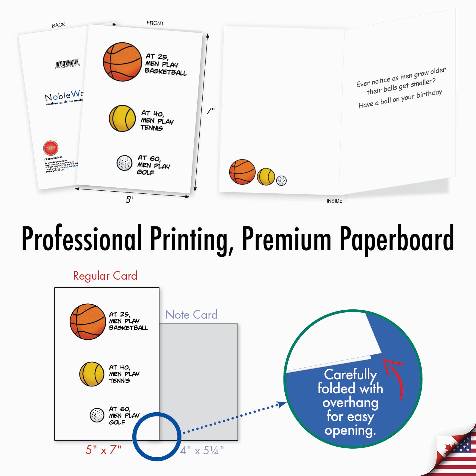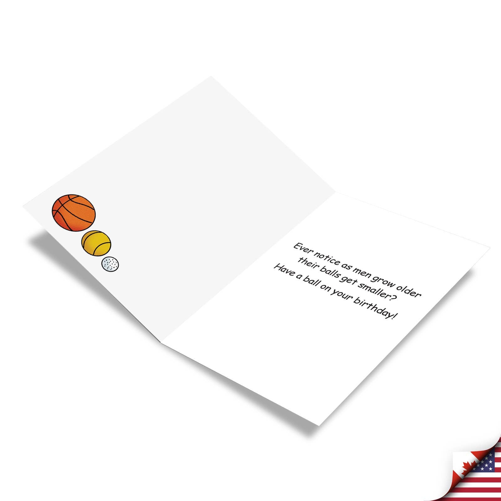 Send some hilarious, age-appropriate humor with our "Age Of Balls" birthday card, perfect for the guy in your life. The front cleverly illustrates the evolution of sports, showing a basketball at age 25, a tennis ball at 40, and a golf ball at 60. The real punchline is inside, with the cheeky observation, "Ever notice as men get older their balls get smaller? Have a ball on your birthday!" This witty and slightly naughty card is a guaranteed way to bring a big laugh to his special day.