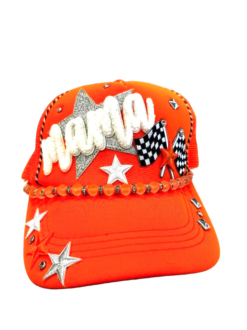 Elevate your fashion game with our Neon Orange Mama Trucker Hat! This trendy hat features a rhinestone & beaded hat chain, studded detailing, a glitter star, and a chenille Mama patch. The black and white twine accents around the foam body add a touch of uniqueness. Stand out from the crowd and add a pop of color to your wardrobe now!
