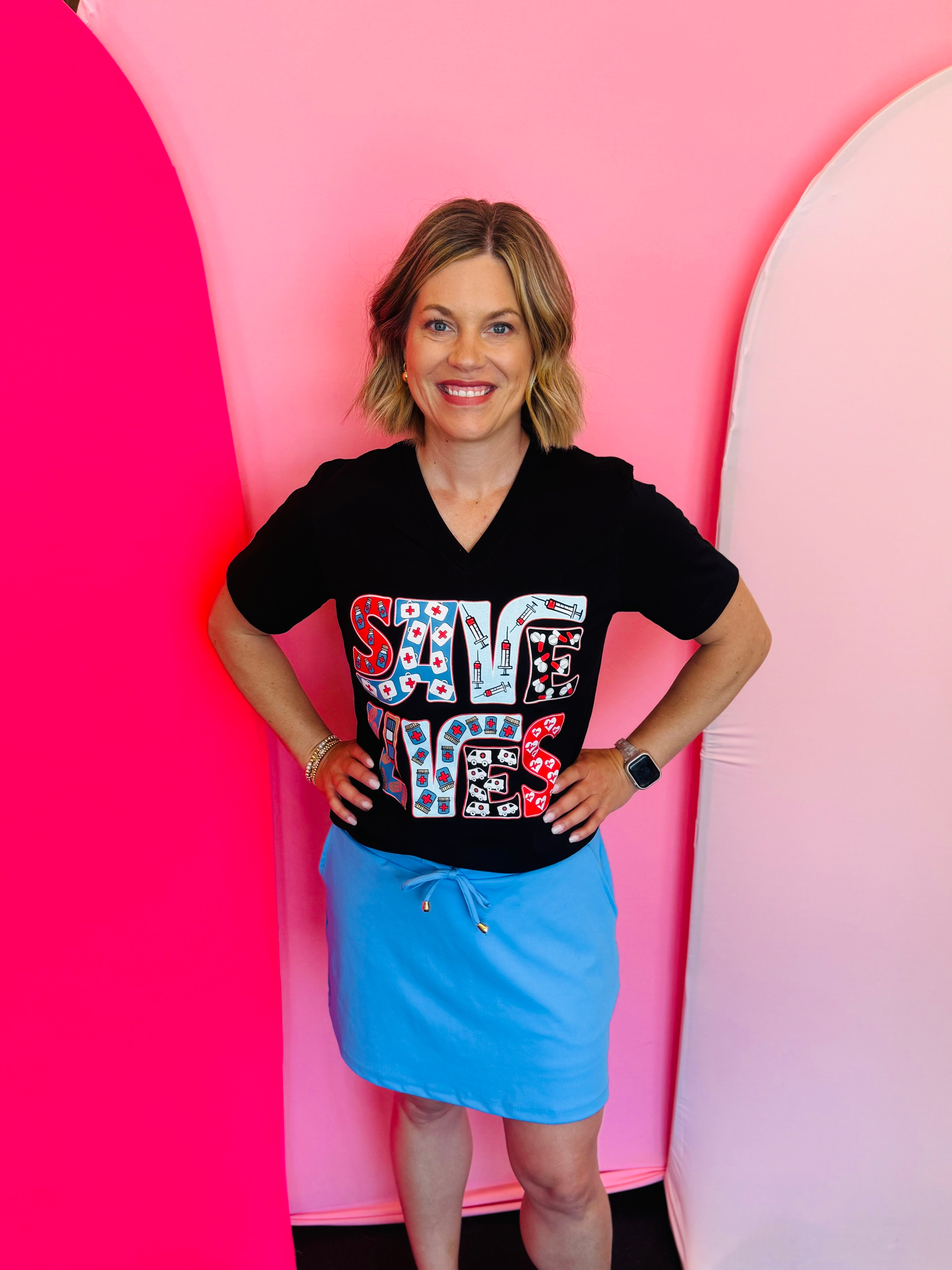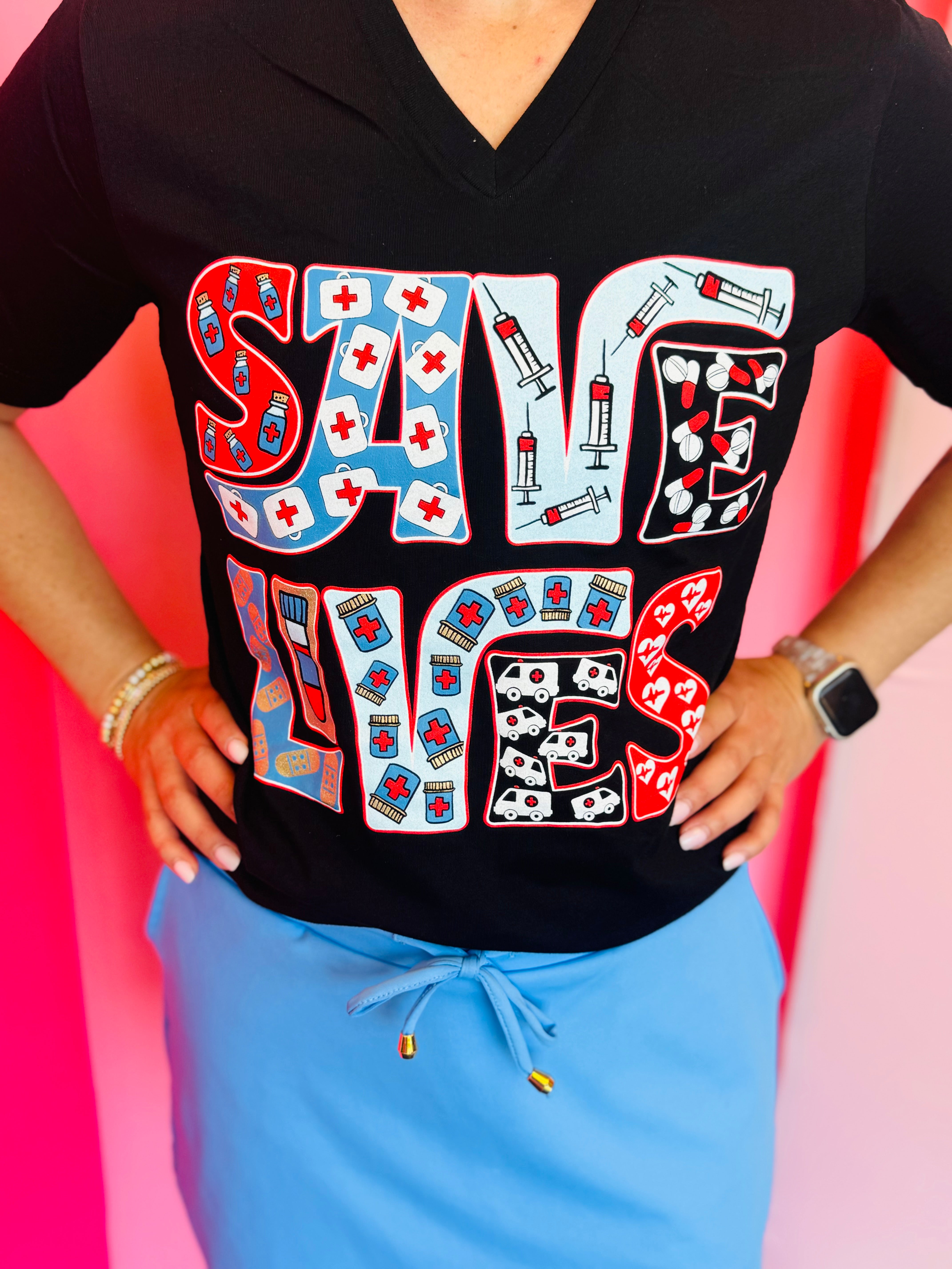This playful Save Lives V-Neck Tee is the perfect way to show your appreciation for nurses! With a black v-neck and colorful graphics, its unique design includes nurse motifs that spell out the important message. Not only will you look great, but you'll also be supporting a great cause.