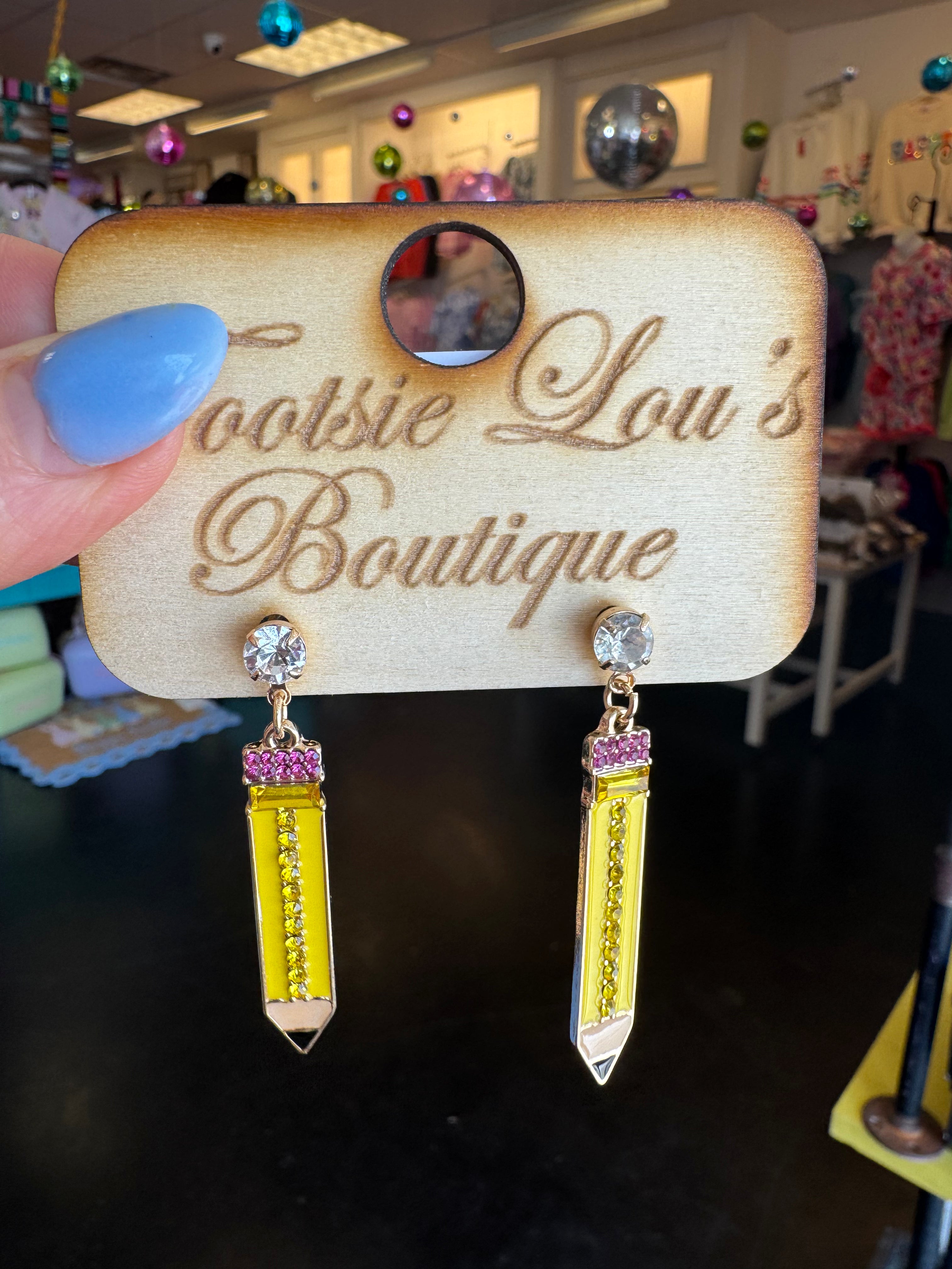 Add some sparkle to your look with these Rhinestone Pencil Earrings! Not just for teachers or accountants, these yellow enamel pencils feature rhinestone erasers and studs for a touch of playfulness to any outfit. Perfect for the classroom or office!