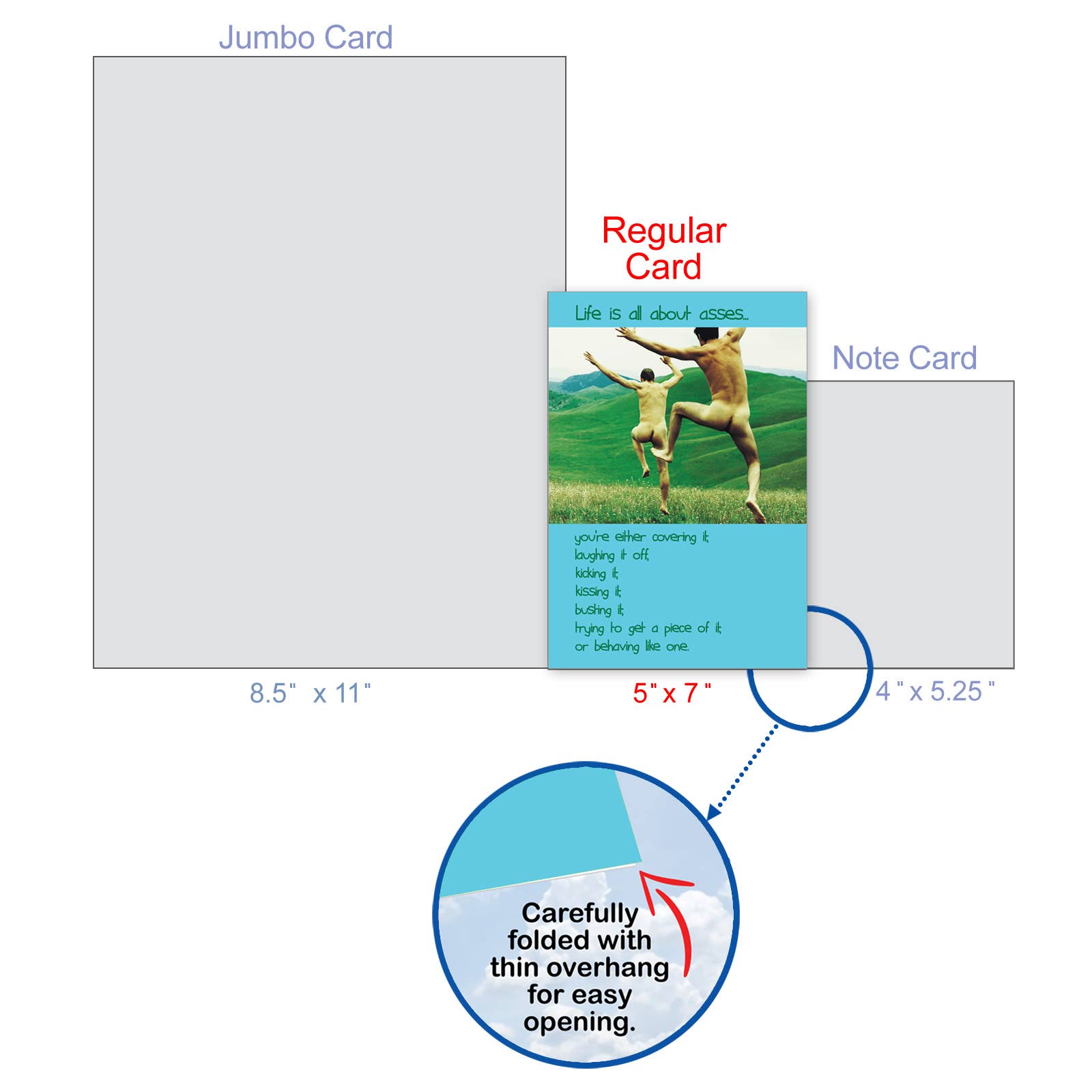 Deliver some cheeky birthday humor with the "All About Asses" card, perfect for friends who love a good laugh. The cover features a comically relatable observation: "Life is all about asses: You're either covering it, laughing it off, kicking it, kissing it, busting it, trying to get a piece of it or behaving like one." The punchline inside continues the fun, telling the recipient to "Now Get Your Ass In Gear And Celebrate." Proudly printed in the USA, this card is a hilarious and unforgettable way to wish someone the best on their special day.