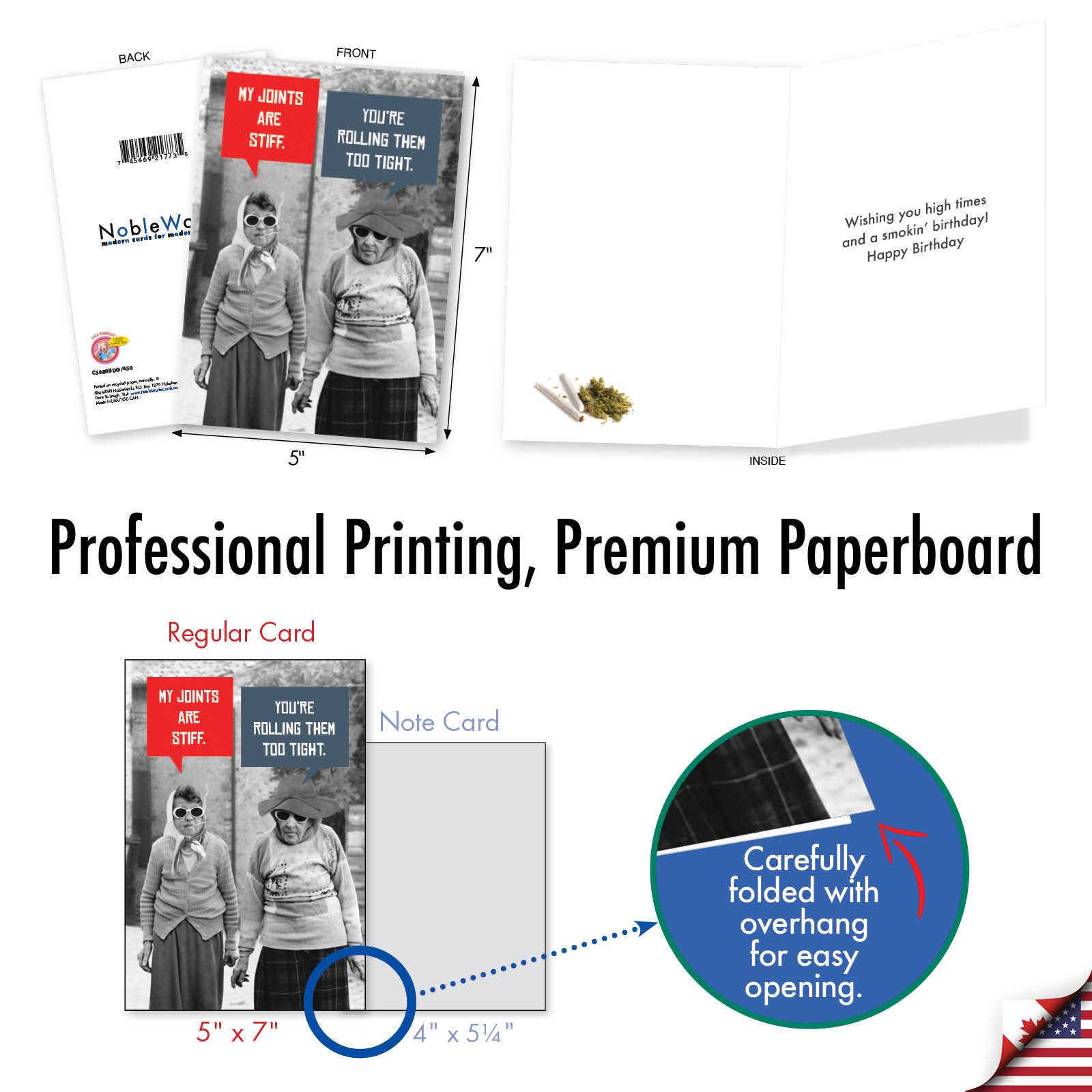 Send some high-spirited humor with our "Stiff Joints" birthday card, perfect for the friend who appreciates a good 420-friendly joke. The front features the classic punny exchange: "My joints are stiff." "You're rolling them too tight." The party continues inside with the perfectly themed message, "Wishing you high times and a smokin' birthday! Happy Birthday." This clever card is a guaranteed way to bring a big laugh to their special day.