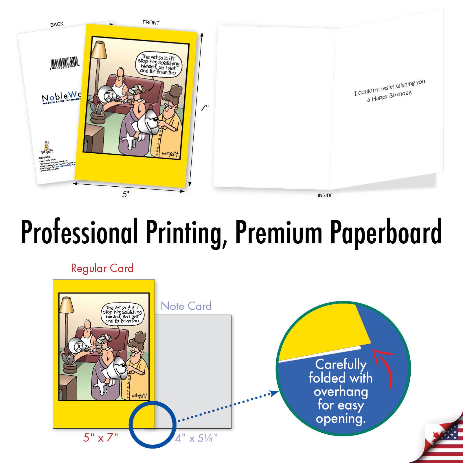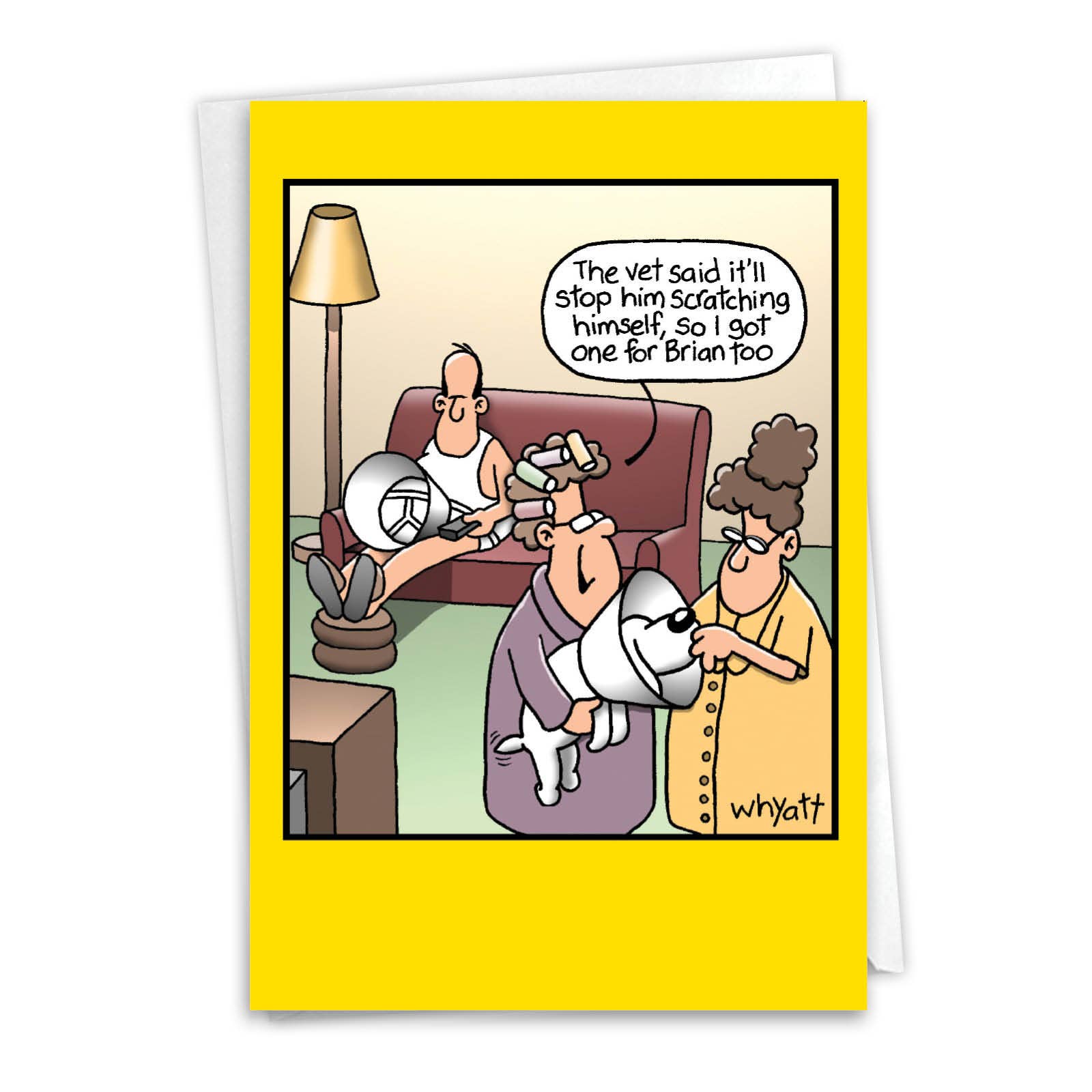Share a hilarious birthday laugh with the "Stop Scratching" card. The front features a funny scenario where a woman says of her dog's cone, "The Vet Said It'll Stop Him From Scratching Himself, So I Got One For Brian Too," implying her husband is also in one! The witty humor continues inside with the perfect message: "I Couldn't Resist Wishing You A Happy Birthday." This card is proudly printed in the USA on FSC-certified, sustainable paper and includes a matching envelope. It’s the perfect choice for anyone who loves a cheeky joke.