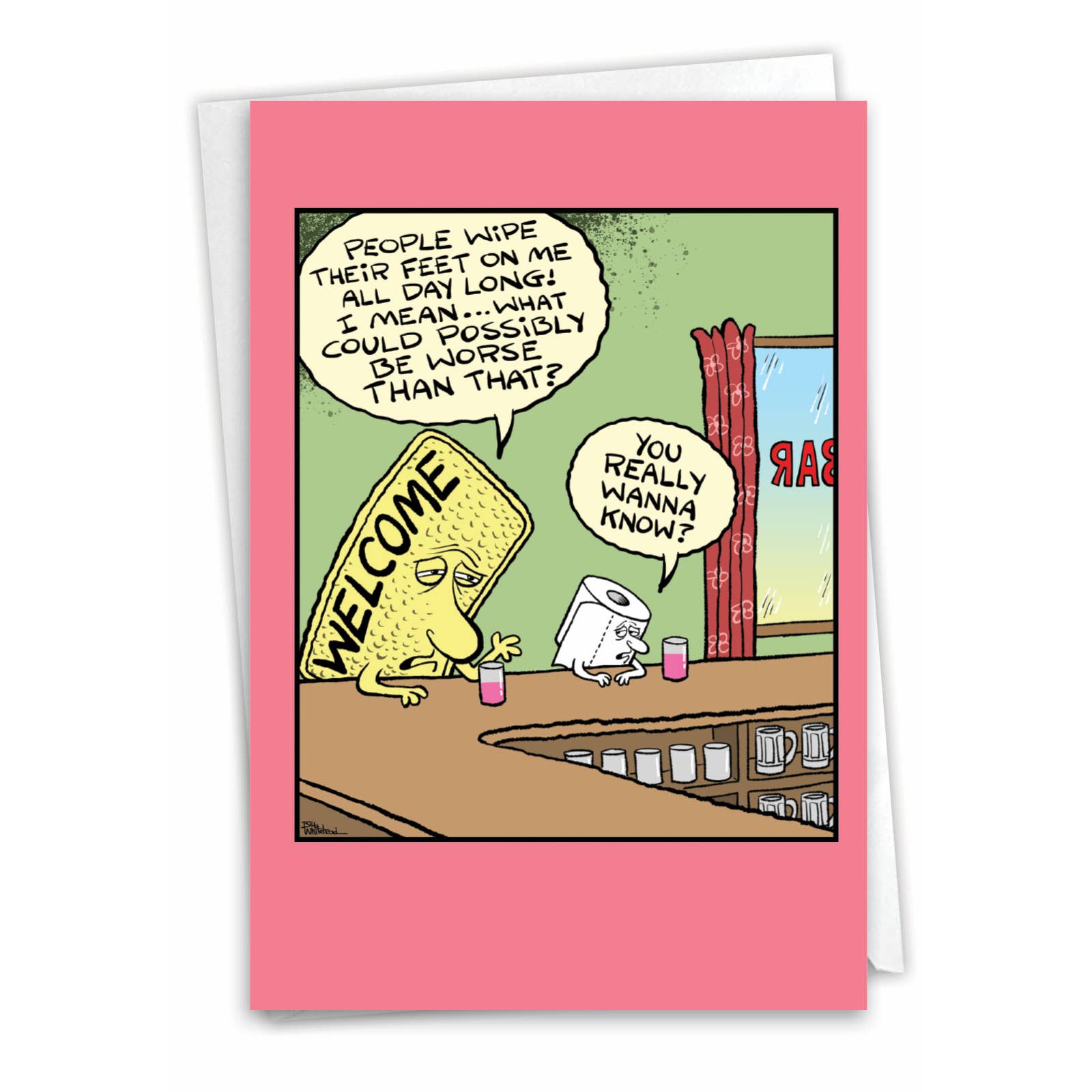 Send a laugh with our hilarious "Welcome Mat" Birthday Card, perfect for anyone who appreciates a good joke about life's little indignities. The front features a welcome mat complaining, "People wipe their feet on me all day long! I mean...what could possibly be worse than that?" The punchline is revealed with a birthday cake rolling pin approaching, as the mat asks, "You really wanna know?" The inside wishes them well as, "Another year rolls by! Happy Birthday." It's a clever and funny way to celebrate.