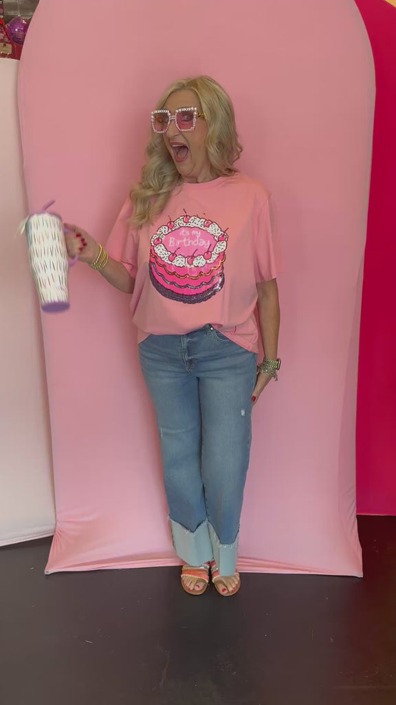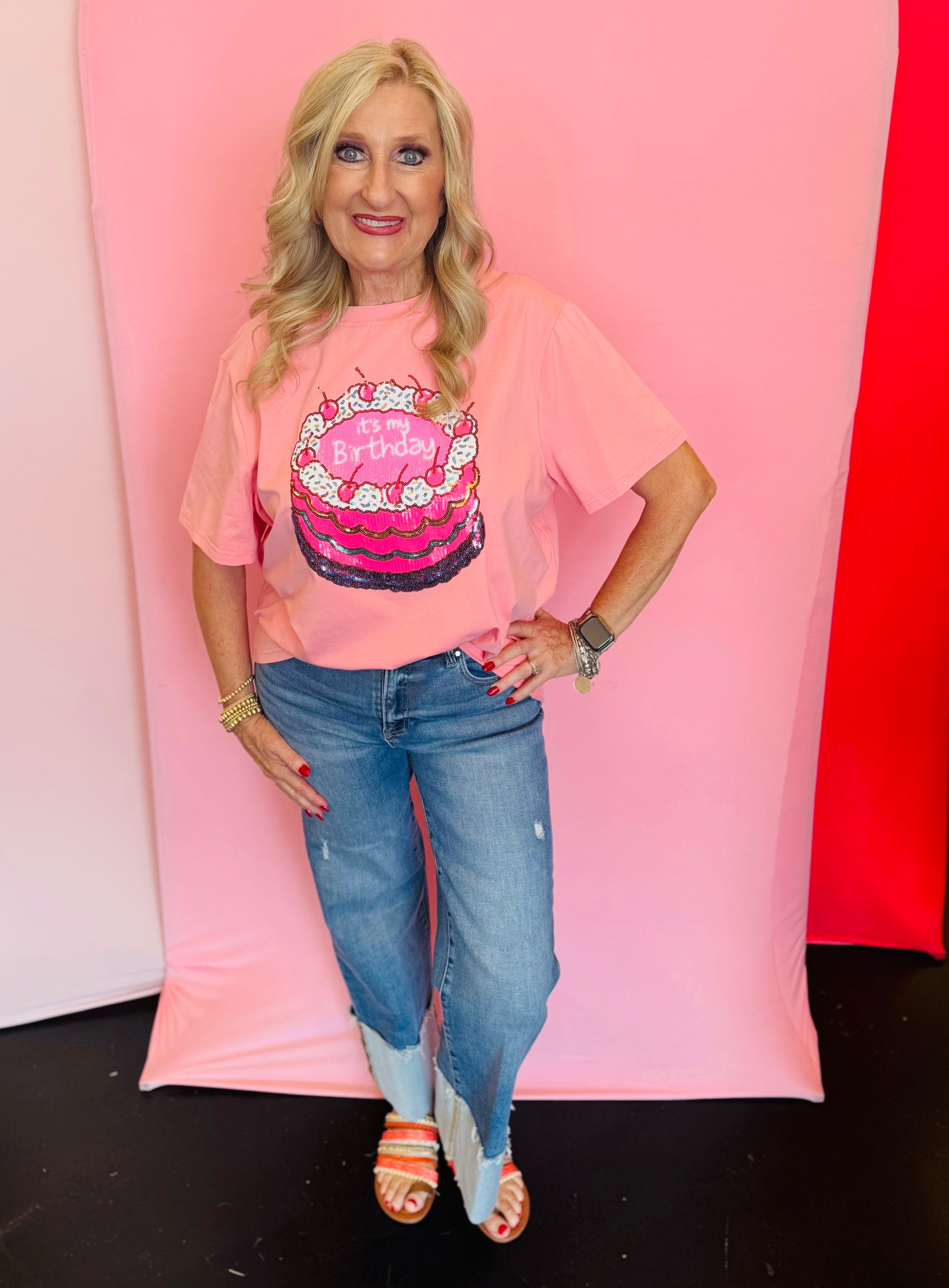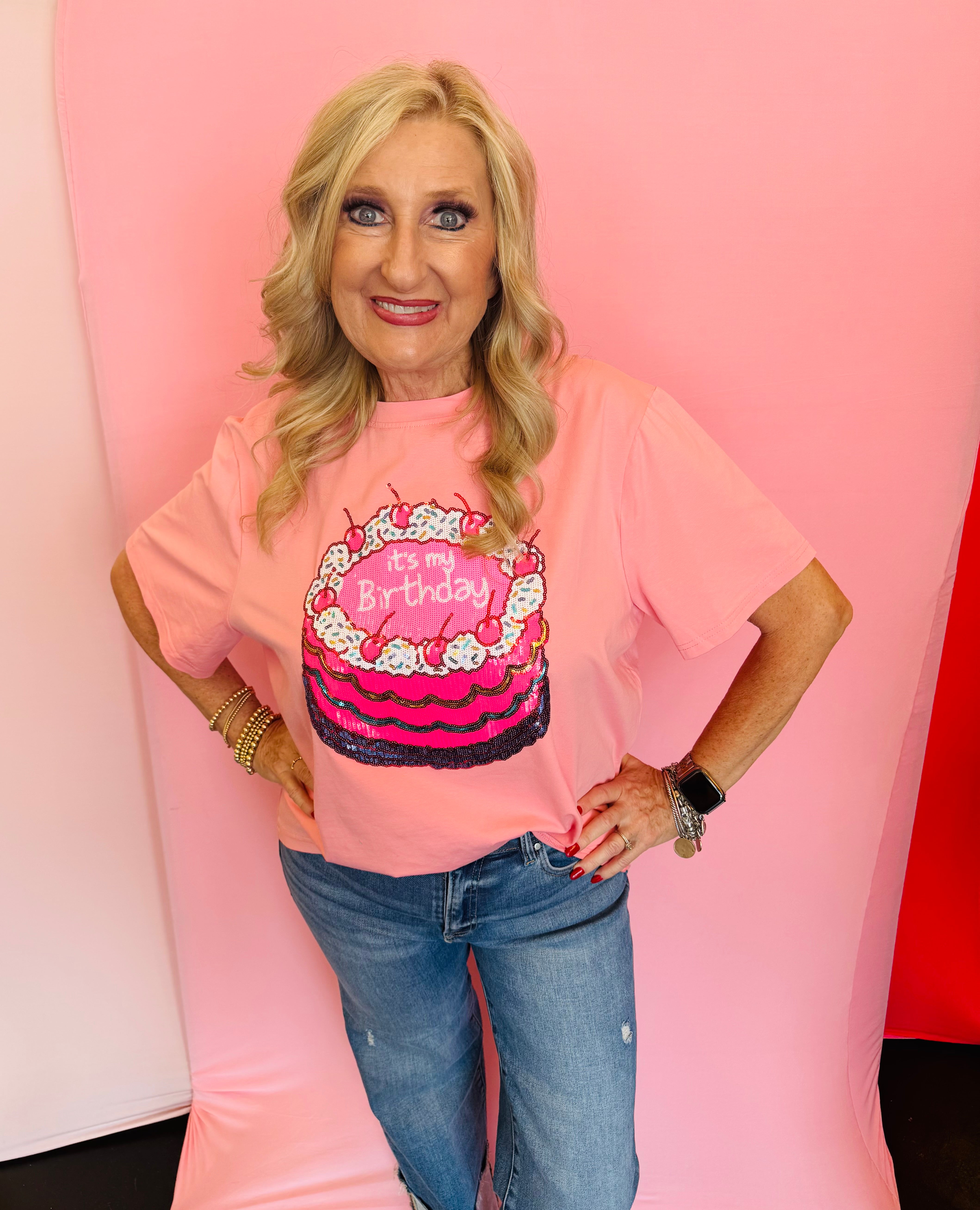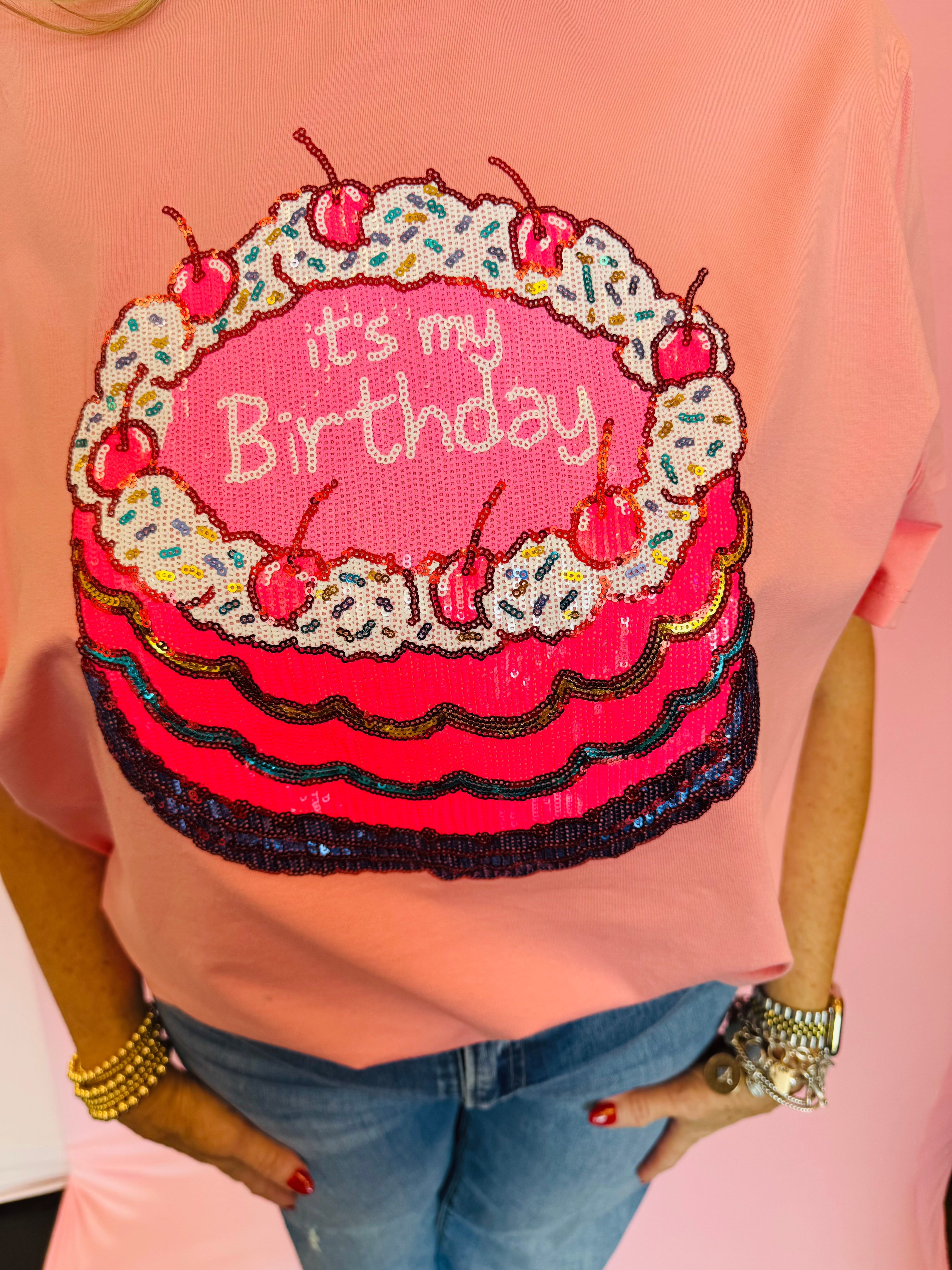 Celebrate your special day in sparkling style with our "It's My Birthday" Pink Tee! This festive t-shirt is crafted from a soft and stretchy blend for a perfectly comfortable fit. The vibrant pink tee features a bold, multi-layered birthday cake graphic, lavishly decorated with shimmering sequins that catch the light. Across the front, the phrase "It's My Birthday!" is proudly displayed. It is the perfect statement piece to ensure all eyes are on you during your celebration.