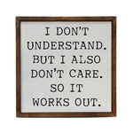 I Don't Understand But I Also Don't Care So It Works Out Wood Wall Hanging. All our signs are build into a wooden box frame with a rustic touch. Signs are hung directly off the frame.