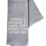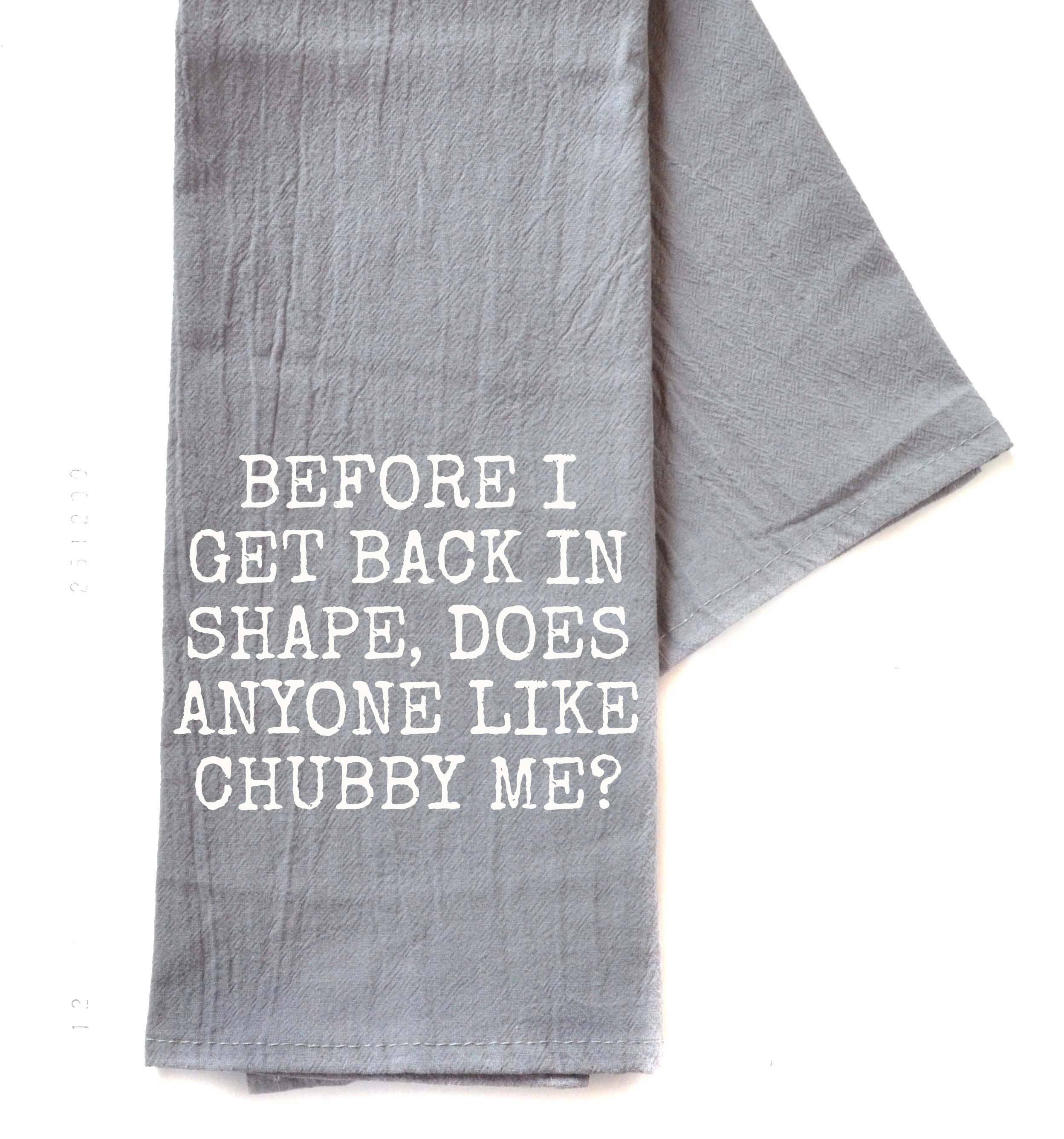 Say goodbye to boring kitchen towels and hello to our Before I Get Back in Shape Friend Gift. This whimsical tea towel makes a hilarious statement with its crinkled 100% cotton fabric and non-toxic White ink. Get the laughs but don't worry, you won't lose your shape while drying dishes! Handmade in the USA for an eco-friendly gift your friends will love!