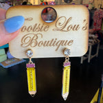 Add some sparkle to your look with these Rhinestone Pencil Earrings! Not just for teachers or accountants, these yellow enamel pencils feature rhinestone erasers and studs for a touch of playfulness to any outfit. Perfect for the classroom or office!