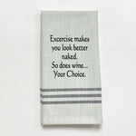 Add some humor to your kitchen with the Exercise Makes You Look Better Tea Towel! This medium grey towel features a bold black lined trim and a playful message that will make you smile while you cook. Made of 100% cotton twill, this machine washable towel is not your average flour sack. Whether it's for yourself or a friend, this hand printed towel is the perfect gift for any occasion. And remember, exercise and wine both have their benefits. Your choice!