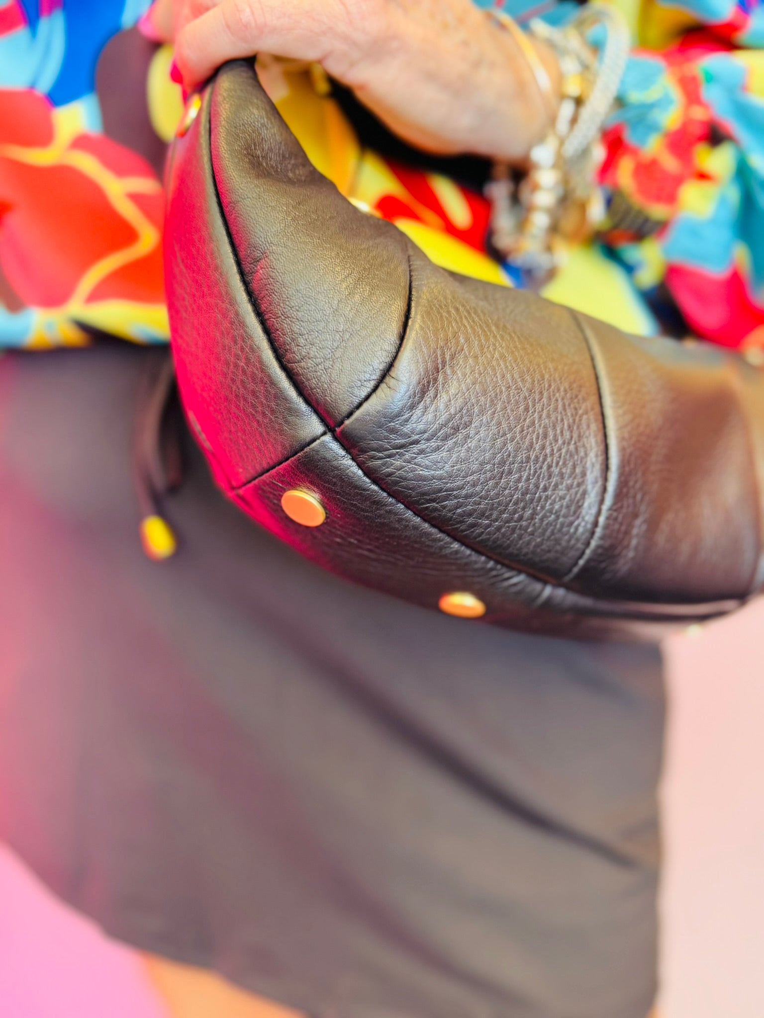 Signature brushed gold riveted hardware for iconic Hammitt style