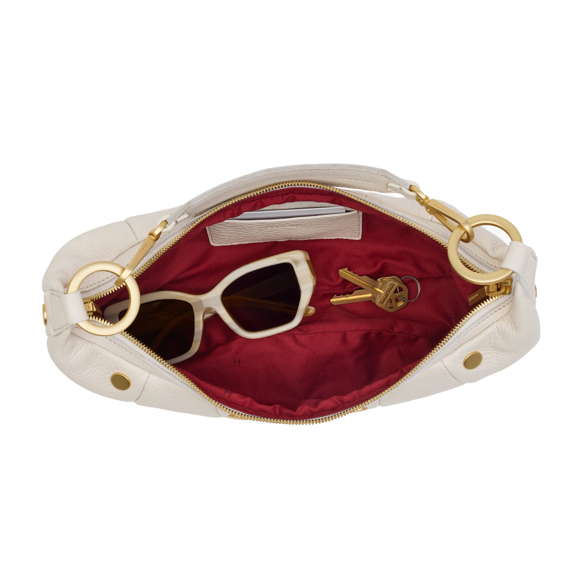 Meet your new everyday essential: the Hammitt Erica SML in Calla Lily White, a modern croissant-style bag designed to move seamlessly from daytime outings to evenings out. Crafted from luxurious pebbled leather in a crisp, creamy white hue, this softly structured silhouette feels fresh, polished, and effortlessly chic. The bold, chunky short strap adds a fashion-forward touch, while the detachable crossbody option offers hands-free convenience for busy days on the go. Signature Hammitt details — including brushed gold riveted hardware, sculptural leather paneling, and the iconic red twill lining — give this compact bag a designer feel that stands out. Plus, Hammitt backs the hardware with a lifetime warranty, so you can carry it with confidence for years to come.