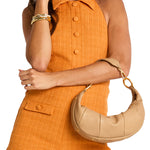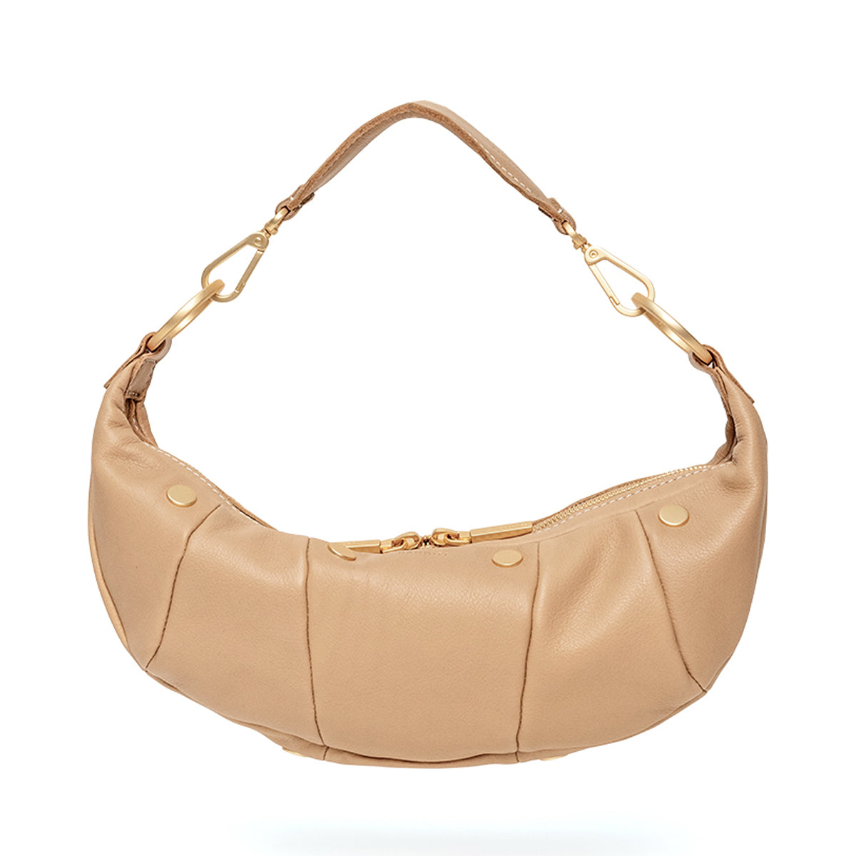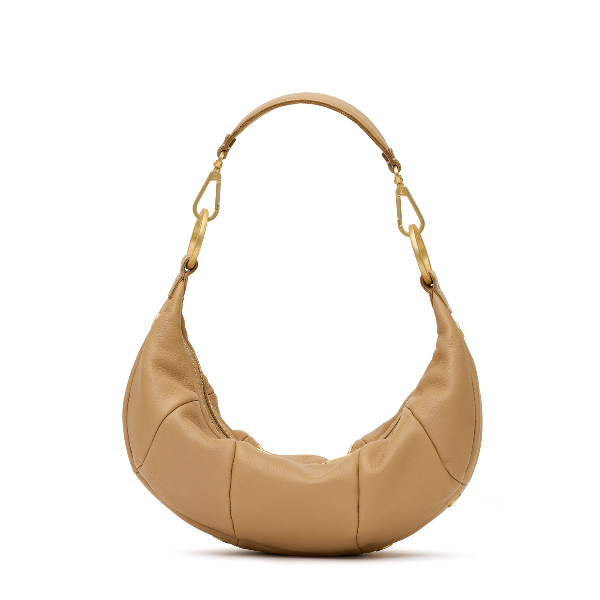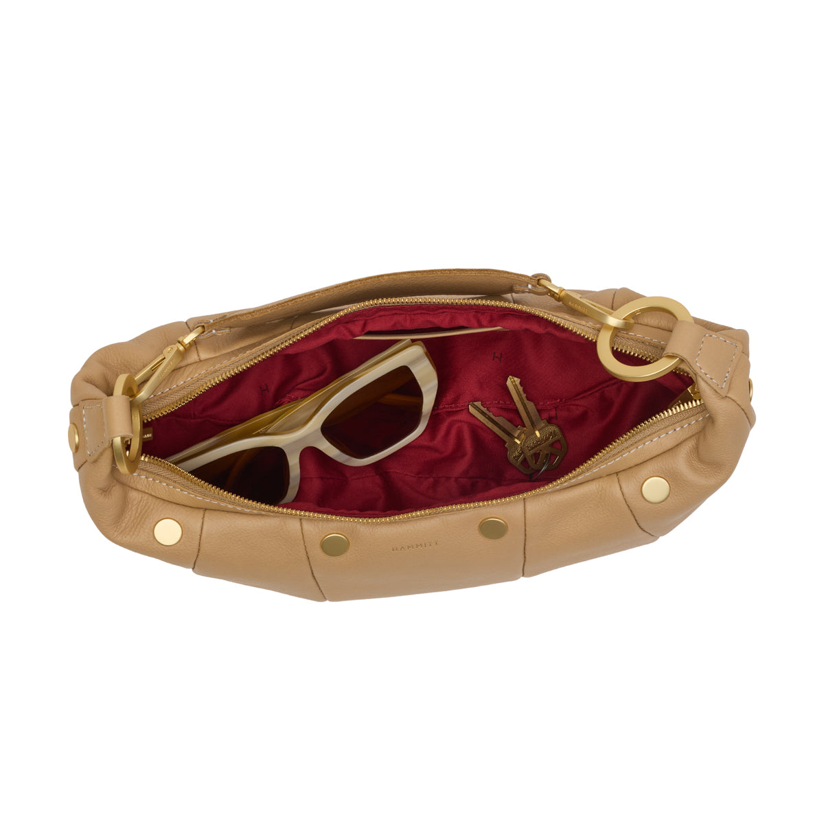 Meet your new everyday essential: the Hammitt Erica SML in Toasty Sand, a modern croissant-style bag designed to move effortlessly from daytime errands to nights out. Crafted from pale tan pebbled leather — a fresh update to classic Toast Tan — this softly structured silhouette feels relaxed yet refined. The bold, chunky short strap gives it a fashion-forward edge, while the detachable crossbody option provides hands-free convenience when you’re on the go. Signature Hammitt details — including brushed gold riveted hardware, sculptural paneling, and luxe red twill lining — make this compact bag feel anything but basic. Even better, Hammitt backs the hardware with a lifetime warranty, so you can carry it confidently for years to come.