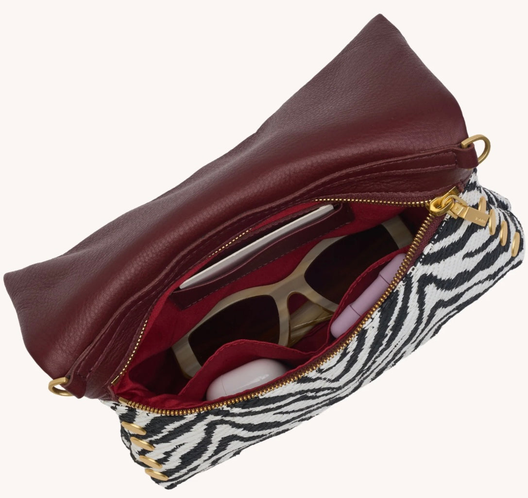 Meet the Hammitt VIP Med Zebra Brushed Gold, a striking take on Hammitt’s most iconic and best-selling silhouette. Designed for intentional organization and effortless versatility, this VIP clutch offers room for essentials without sacrificing style. Crafted with bold black-and-white natural raffia featuring dynamic texture, paired with deep oxblood red pebble leather accented by warm brown and red undertones, this bag delivers eye-catching contrast and undeniable luxury. Hammitt’s signature brushed gold hardware—guaranteed for life—adds an elevated finish, while subtle embossed rivets and a peek of red along the back seam showcase thoughtful brand details. The interior features red cotton twill lining, two drop pockets, a credit card slot, and zippered compartments for secure storage. With an optional strap, the VIP Med seamlessly transforms from clutch to shoulder to crossbody, making it the perfect companion for work, travel, or evenings out.