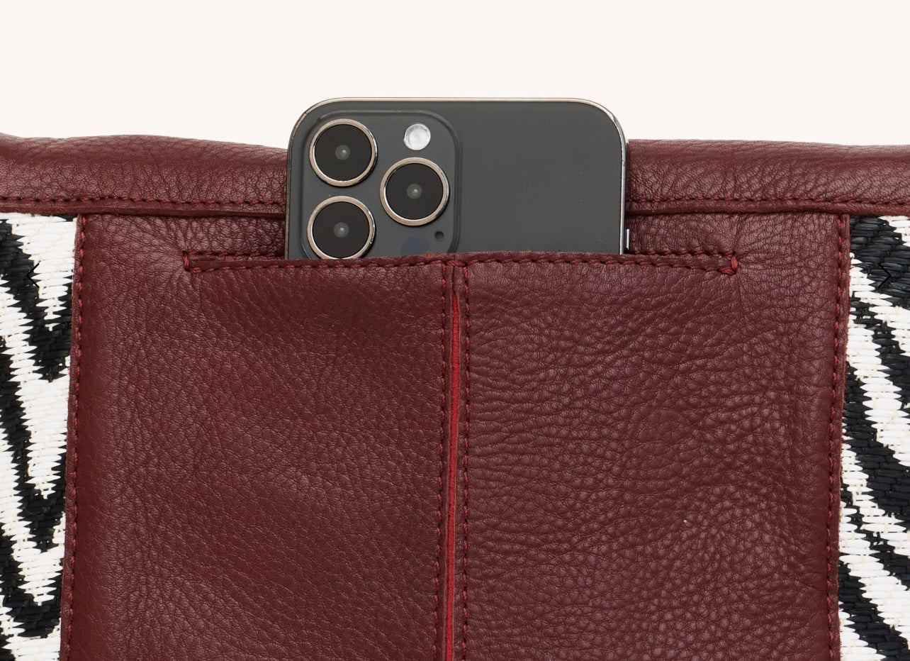 Crafted with black-and-white natural raffia + oxblood pebble leather